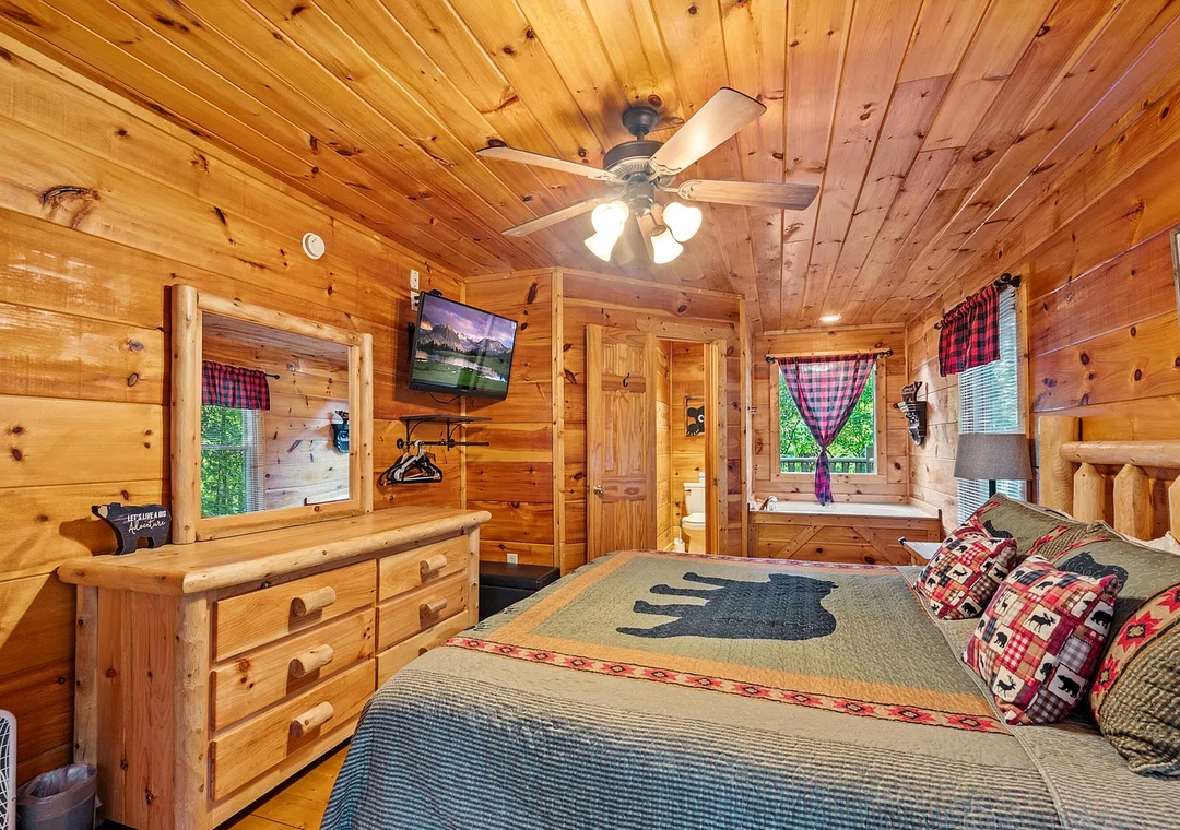 ✔ Master Suite (Main Level): King bed, flat-screen TV, private en-suite bathroom with a jetted soaking tub for ultimate relaxation.