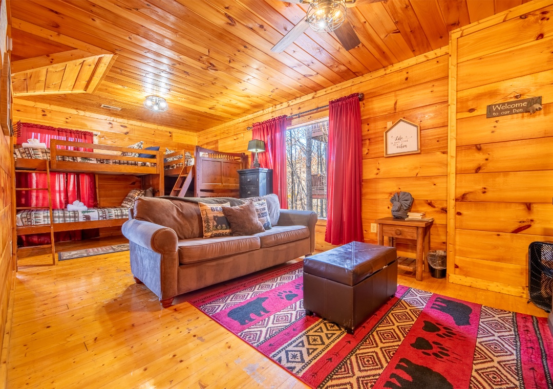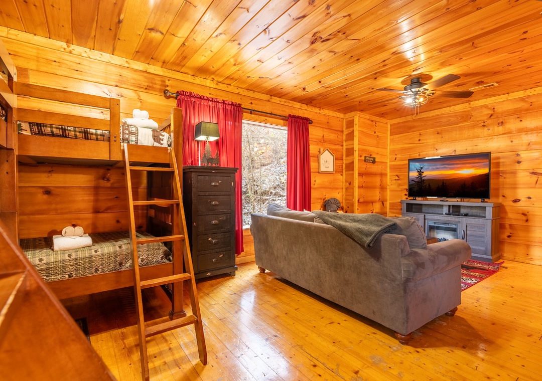 ✔ Lower Level Bunk Area: Two twin-over-twin bunk beds, a sleeper sofa, and a flat-screen TV, ideal for kids or extra guests
