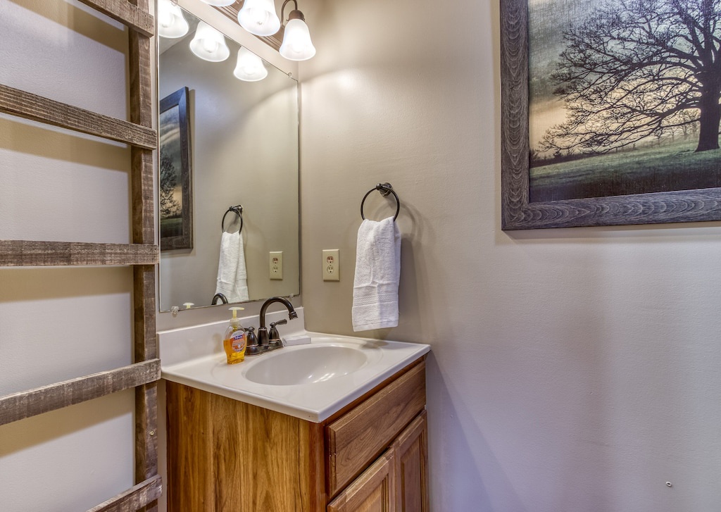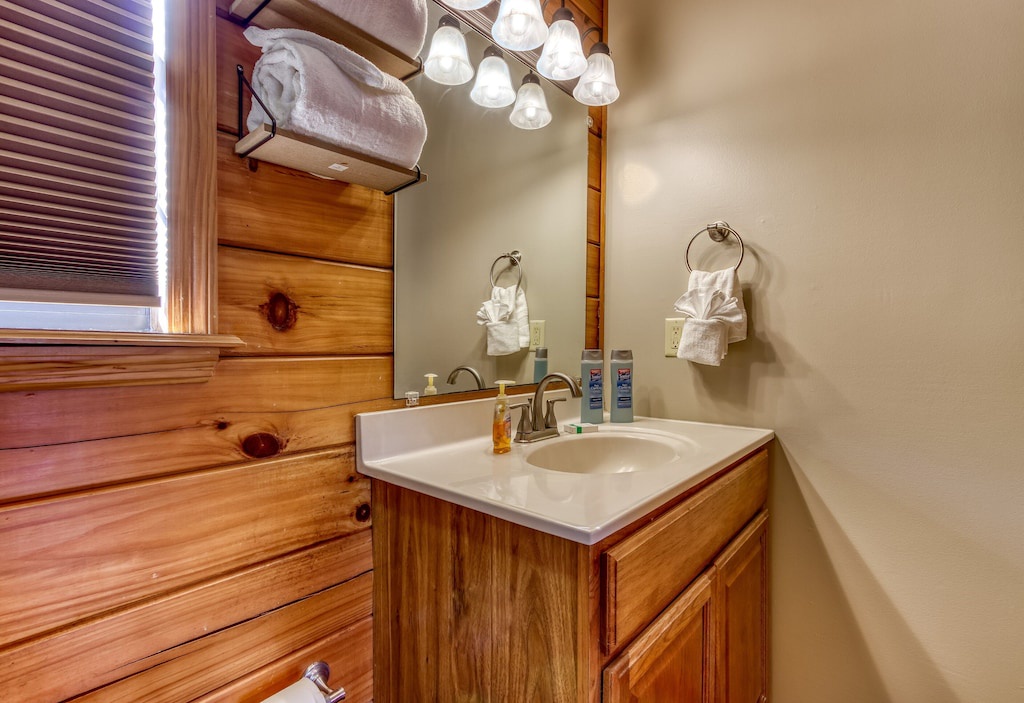 There are two full and one half-bath stocked with all essential toiletries in the cabin. The main floor’s full bathroom is connected to the master bedroom, and the half bath is accessible from the living area. The lower floor has a full bathroom so you don't have to make a trip upstairs every time you need to use the bathroom.