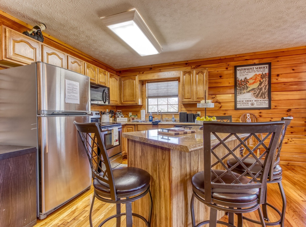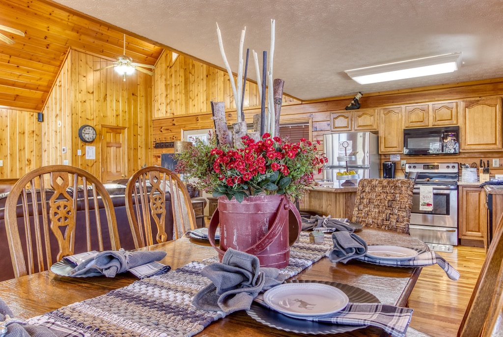The open floorplan kitchen follows the cabin's contemporary design while offering modern appliances and spacious countertops on which you can make delicious meals.