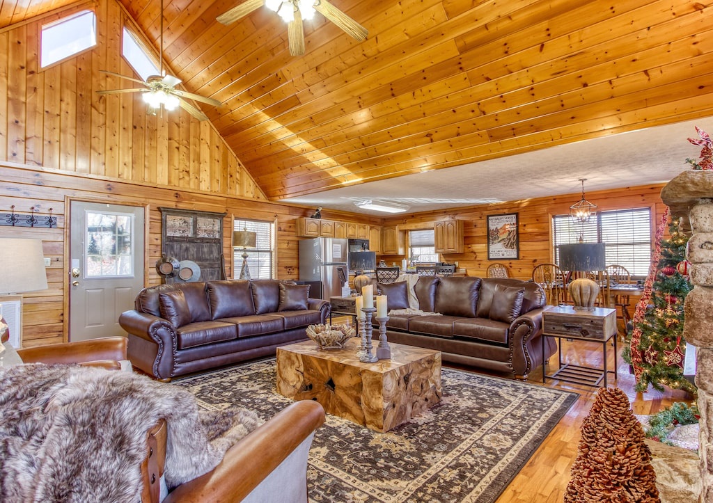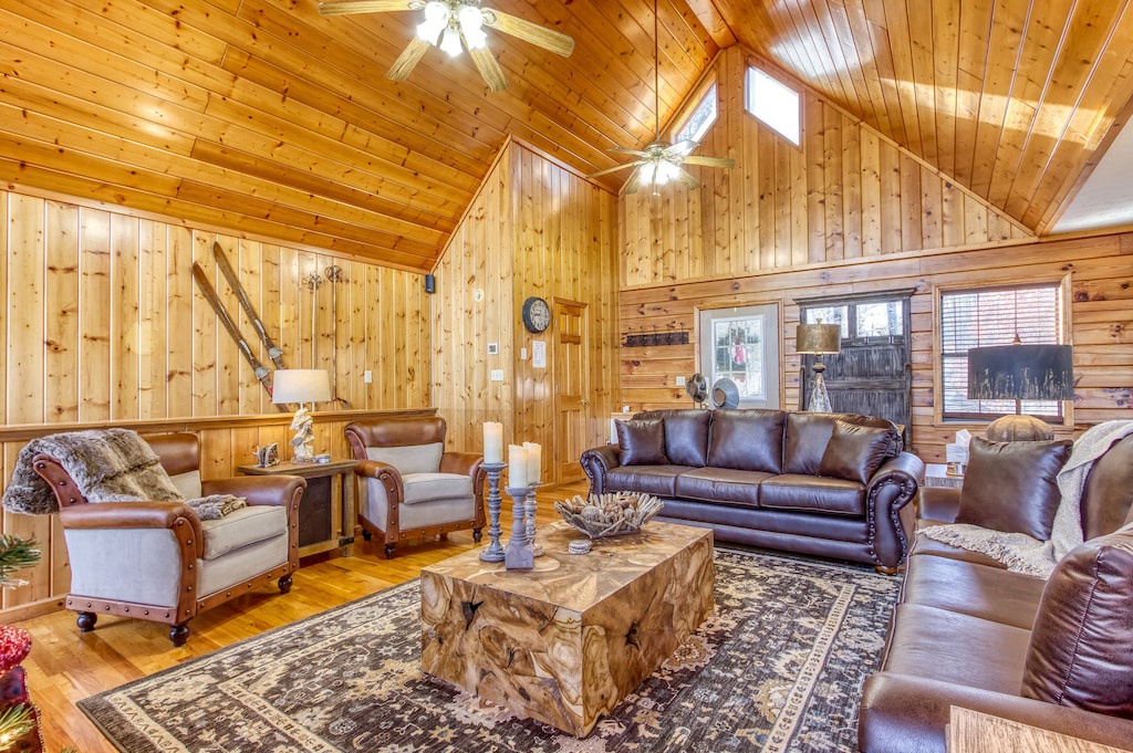 Enjoy the contemporary design and luxurious amenities on each level of this modern log cabin. Healthy natural light shining through its many large windows warm up the space during the day. Cathedral ceilings in the main living area create a unique feeling of exclusivity, while the lower level is full of relaxation and entertainment features.