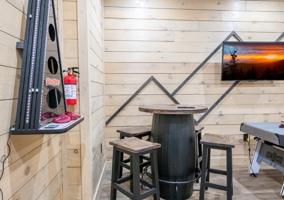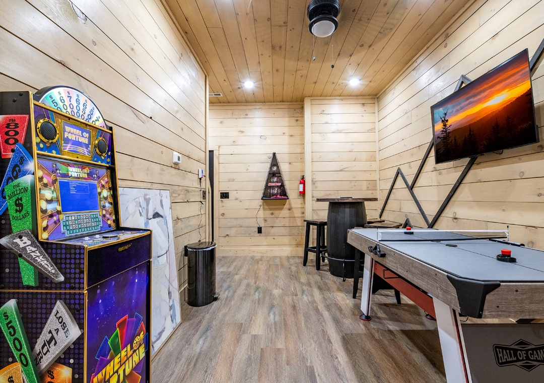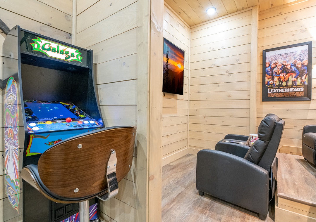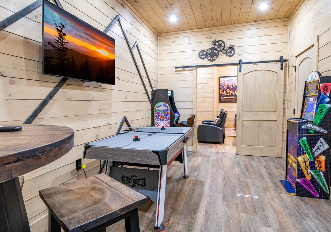Valley Cove is designed with entertainment at its core, offering a wide array of activities that make every moment of your stay unforgettable. The cabin's game room and theater room are fully equipped to entertain guests of all ages. A massive 70” TV anchors the theater area, creating the perfect setup for movie nights and binge-watching sessions. In the game area, you’ll find various arcade and table games that bring endless fun and competition. Challenge friends or family to a game of Ping Pong and Air Hockey, or test your skills with classic arcade machines like the Wheel of Fortune and Galaga. The Bag Toss Game adds a touch of outdoor-style fun, perfect for friendly competitions and family tournaments. For relaxation after a day of gaming, Valley Cove offers a private hot tub located just outside the back door of the second level, where you can unwind under the stars and take in the peaceful surroundings. The cabin also boasts a private heated indoor pool on the main level, providing a luxurious, all-weather oasis that’s perfect for year-round swims without ever leaving the comfort of the cabin. With so many entertainment options, “Valley Cove” ensures that everyone finds something to enjoy.