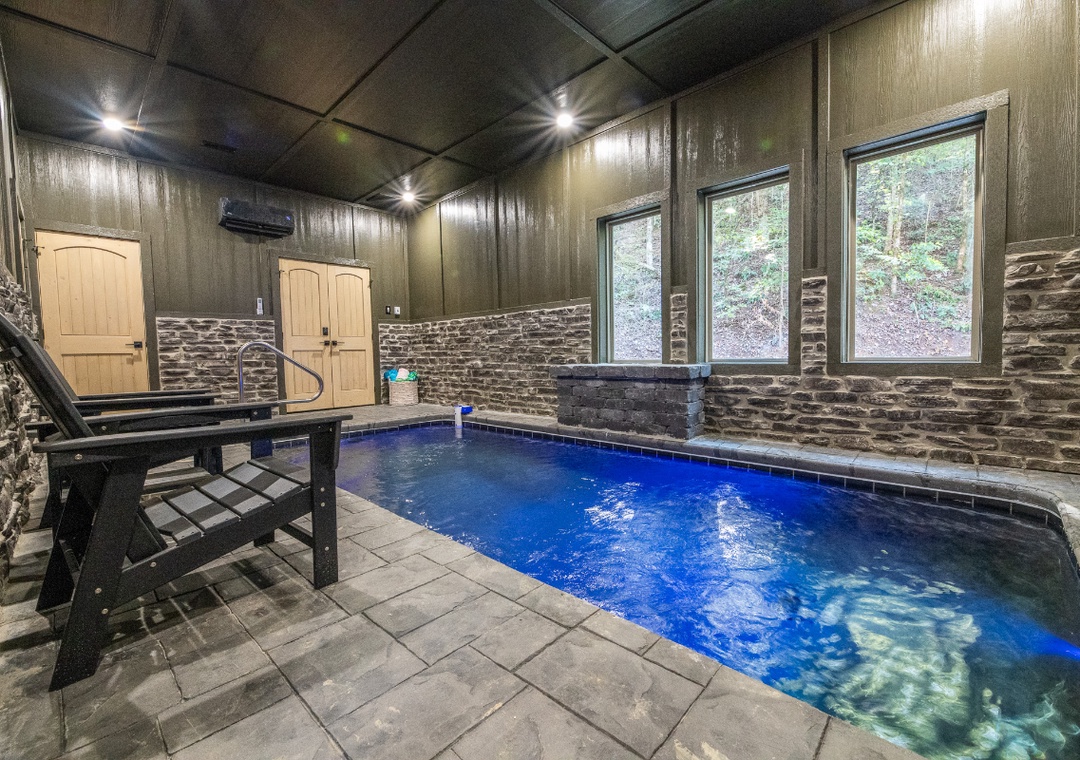 Step inside, and you’ll find a warm and welcoming living space that brings the rustic charm of the Smoky Mountains indoors. The upper level's open-concept design offers a spacious living room centered around a beautiful electric fireplace, where comfortable seating and large windows invite you to settle in. The fully-equipped kitchen on this level blends functionality with style and the inviting dining area makes family meals and gatherings easy and enjoyable. Downstairs on the main level, you’ll find the game room/theater room where fun takes center stage. Just across the game room is your private, heated indoor pool—an oasis of warmth and relaxation that can be enjoyed year-round.