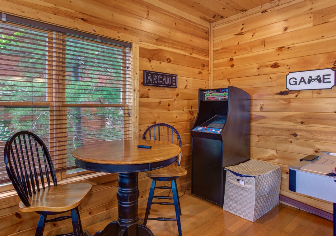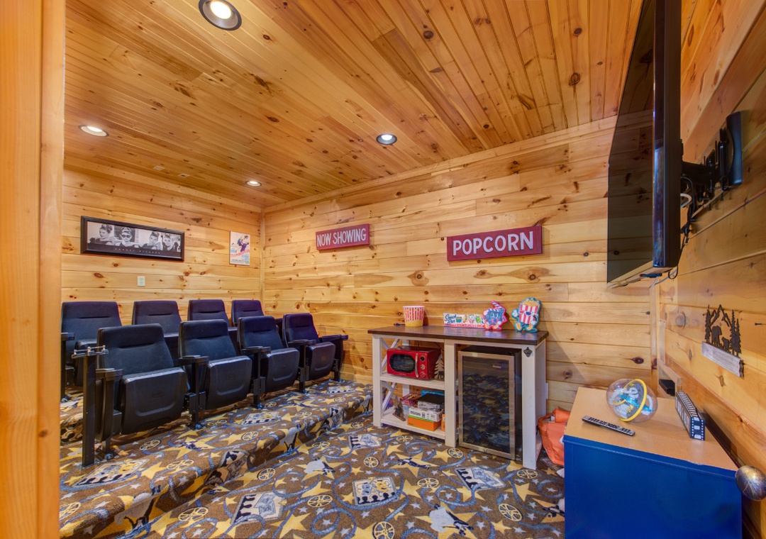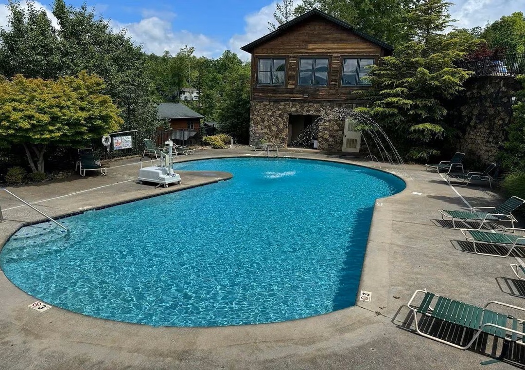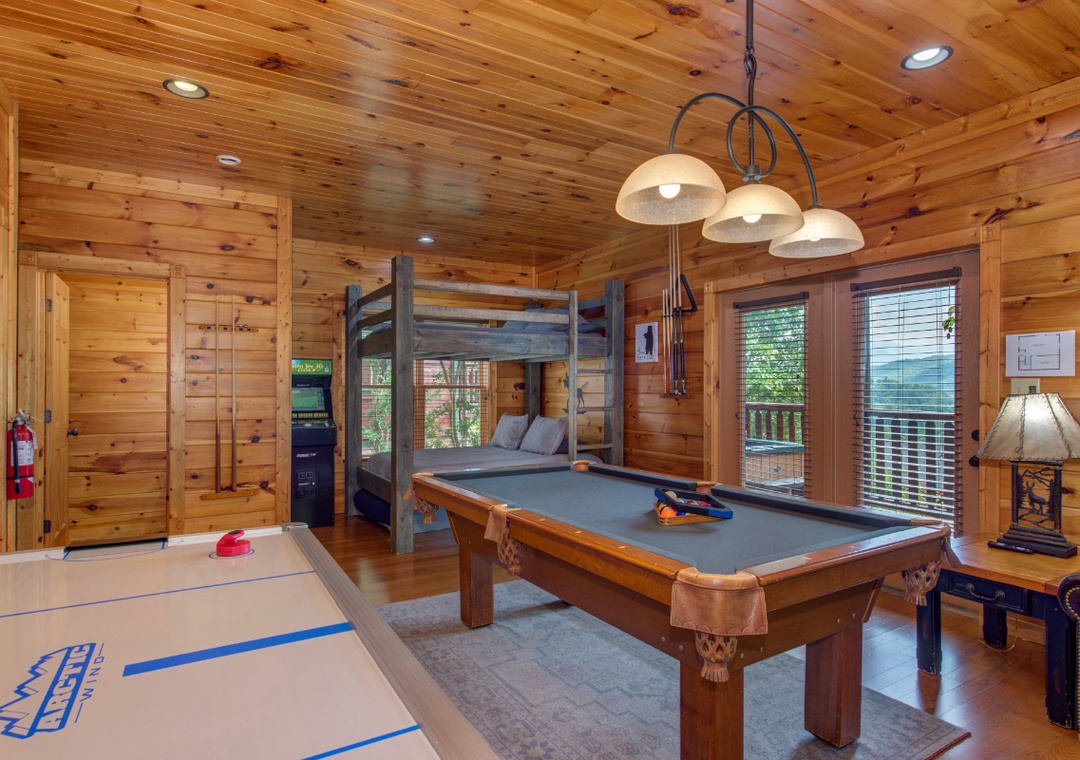 Our cabin is packed with activities designed to cater to both kids and adults, ensuring that every moment spent indoors is just as fun and exciting as exploring the beauty of the Smokies. Start with the Game Room that features a variety of games to keep everyone engaged for hours. Whether you're challenging your friends to a fast-paced air hockey match or showing off your skills at the arcades and pool table, there's always something to do. Just across from the game room, you’ll find the theater room. Equipped with a 65" Samsung Smart TV and DVD player, it’s perfect for movie nights or binge-watching your favorite shows. When it's time to unwind and take in the beauty of the outdoors, the fire pit or the hot tub on the downstairs back deck offers the perfect spot for relaxation. Imagine soaking in the warm, bubbling water while overlooking the stunning Smoky Mountain landscape. And the fun doesn’t stop inside the cabin. As our guest, you’ll also have access to the resort's seasonal community pool (open from Memorial Day to Labor Day, 9am-9pm), where you can swim, lounge, and enjoy the sunshine.