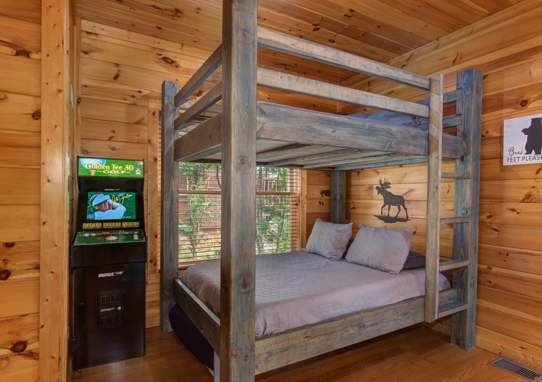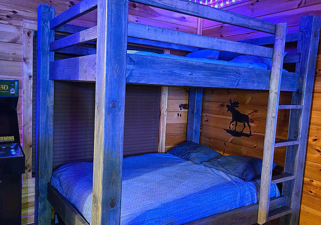 ✔ Game Room: Full-over-Full Bunk Beds with a Twin Trundle, Queen Sleeper Sofa; Access to a Half Bathroom
