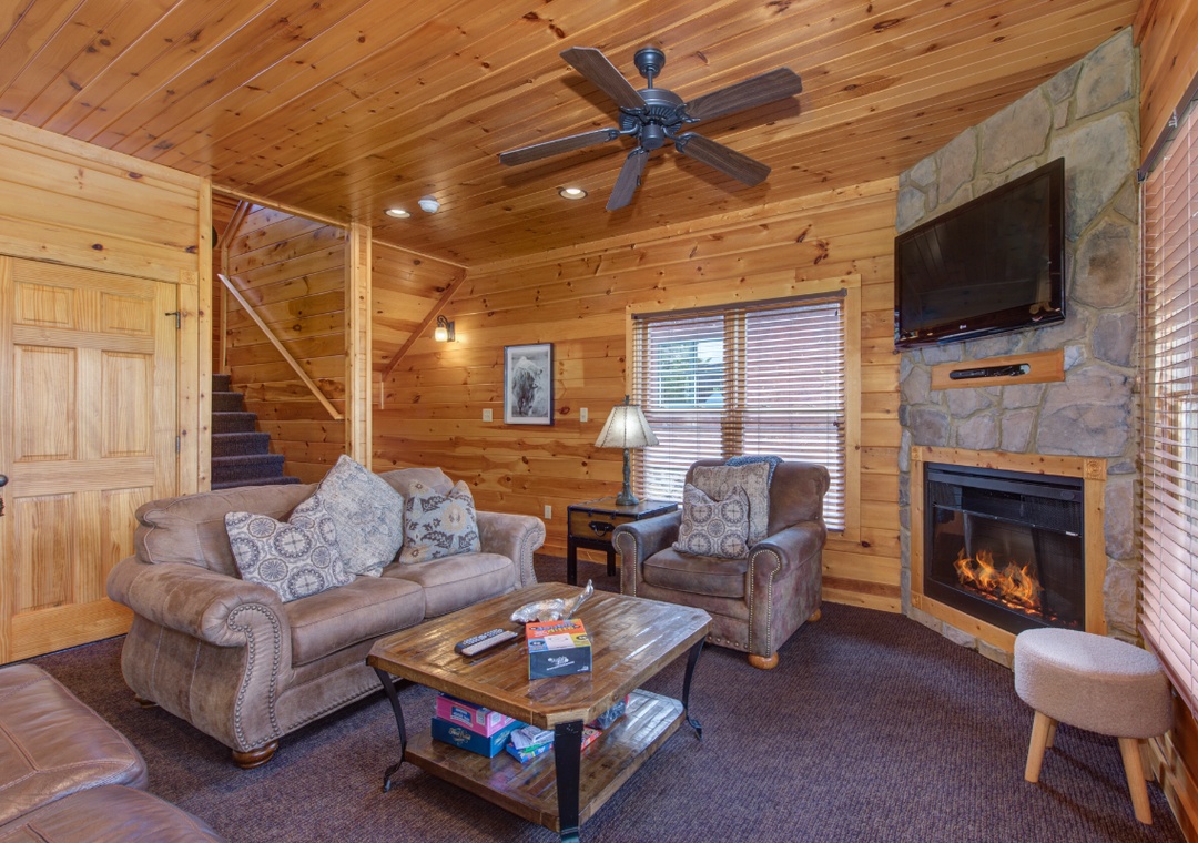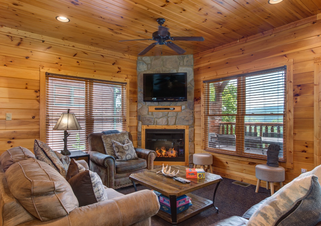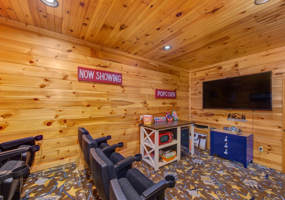 Step inside and you're greeted by a spacious living areawith an electric fireplace, which provides a cozy warmth and inviting glow, perfect for chilly mountain evenings or simply unwinding after a long day of adventure. Large windows fill the room with natural light and frame stunning views of the surrounding mountains, creating a relaxing space to sit back, sip a hot drink, and take in the scenery. The cabin's open-concept design seamlessly connects the living room to the kitchen and dining area, making it easy to gather with family and friends. Downstairs, you'll find a dedicated game room filled with activities for all ages. Adjacent to the game room is the theater room, offering the ultimate setup for movie nights or binge-watching your favorite shows. Free WiFi is also available throughout the property.
