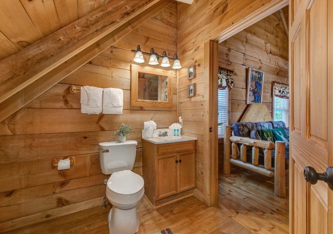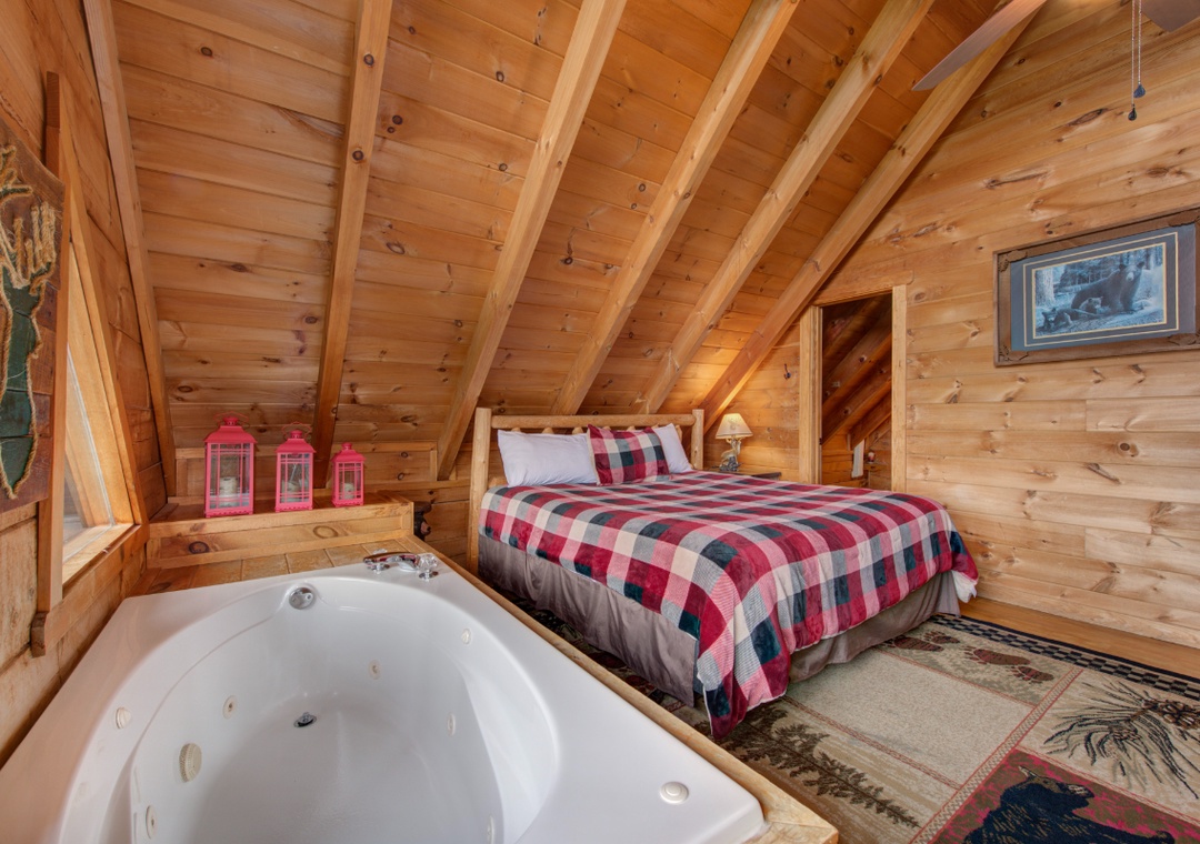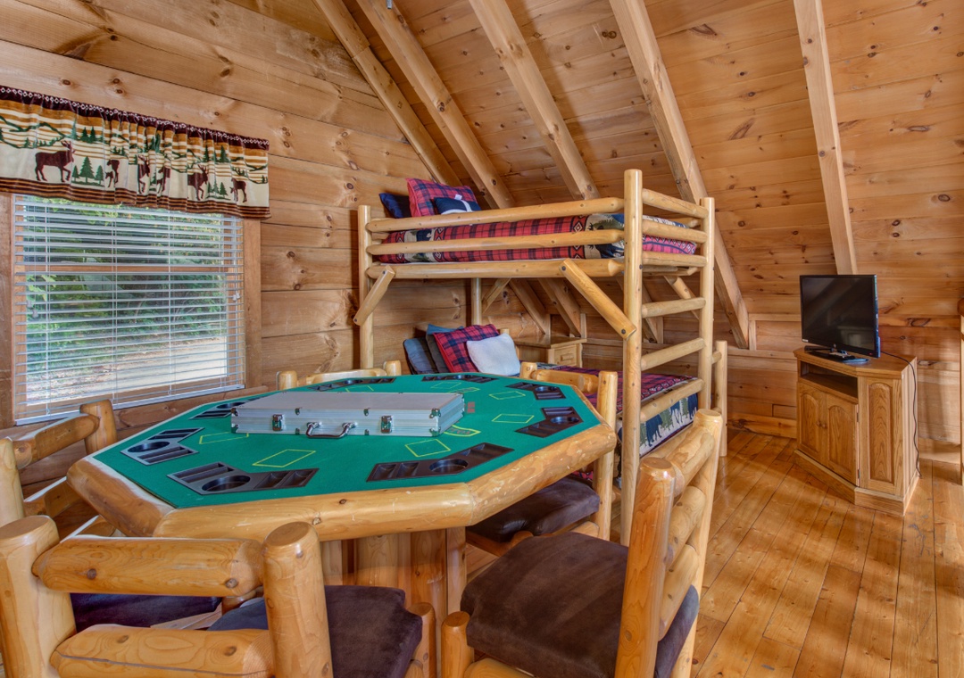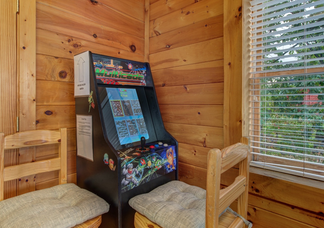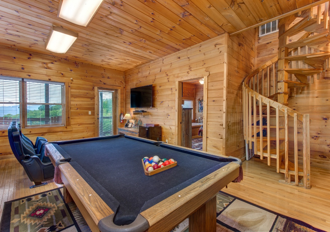 Walk in the Clouds is the perfect place to stay and play or relax! The upstairs loft hosts an additional living space and a comfy couch. Step into the game room/theater room, and you are met with hours and hours of entertainment “ from the pool table, card table, arcade, and a 6-seater home theater, no one will be bored! This is where you'll be transported to a world of comfort and entertainment. And outside, you are greeted with a huge hot tub that overlooks the scenic mountain views. Step onto one of the balconies and sit back and relax in a rocking chair while sipping your morning coffee or evening glass of wine. Whether you're planning a family vacation, a romantic getaway, or a fun-filled adventure with friends, this cabin has it all.