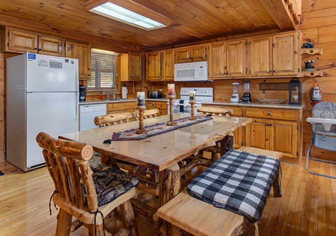 Fully equipped kitchen with full-sized refrigerator, dishwasher, stove, microwave, and other kitchen appliances perfect for making breakfast, lunch, or dinner throughout your stay! All pots, pans, glasses, plates, silverware, etc. are also there for you! There is a gorgeous wooden dining room table right off the kitchen.