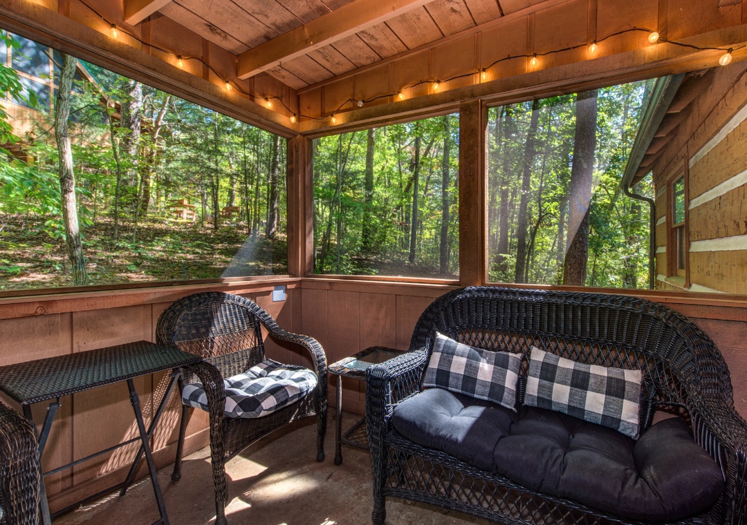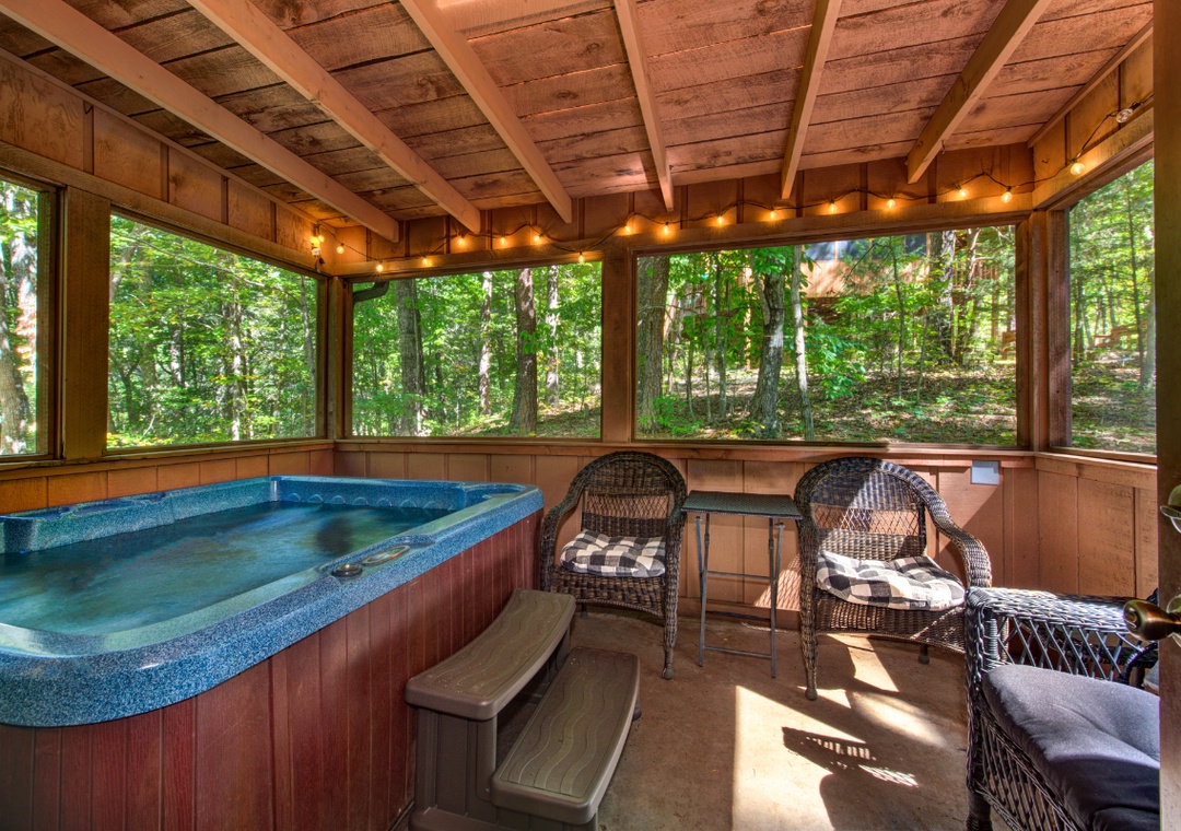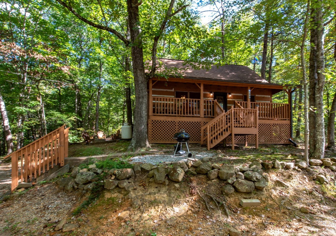 At "Whistling Woods Hideaway," entertainment comes naturally both indoors and out. A set of corn hole boards invites hours of friendly competition on the lawn, while a classic charcoal BBQ grill makes it easy to prepare a casual cookout. Just nearby, a picnic table offers a relaxed setting to enjoy your meal surrounded by the woods. As the day winds down, the firepit area becomes a favorite gathering spot, where guests can roast marshmallows, share stories, and watch the stars appear over the Smoky Mountain sky. Inside, the upstairs bedroom doubles as a game room, complete with two arcade machines that bring a touch of nostalgia for adults and plenty of excitement for kids. A poker table adds to the mix, making it easy to host game nights right at the cabin. And for those seeking relaxation, the enclosed porch with a hot tub provides a peaceful retreat with views of the surrounding woods, making it just as much a part of the entertainment experience.