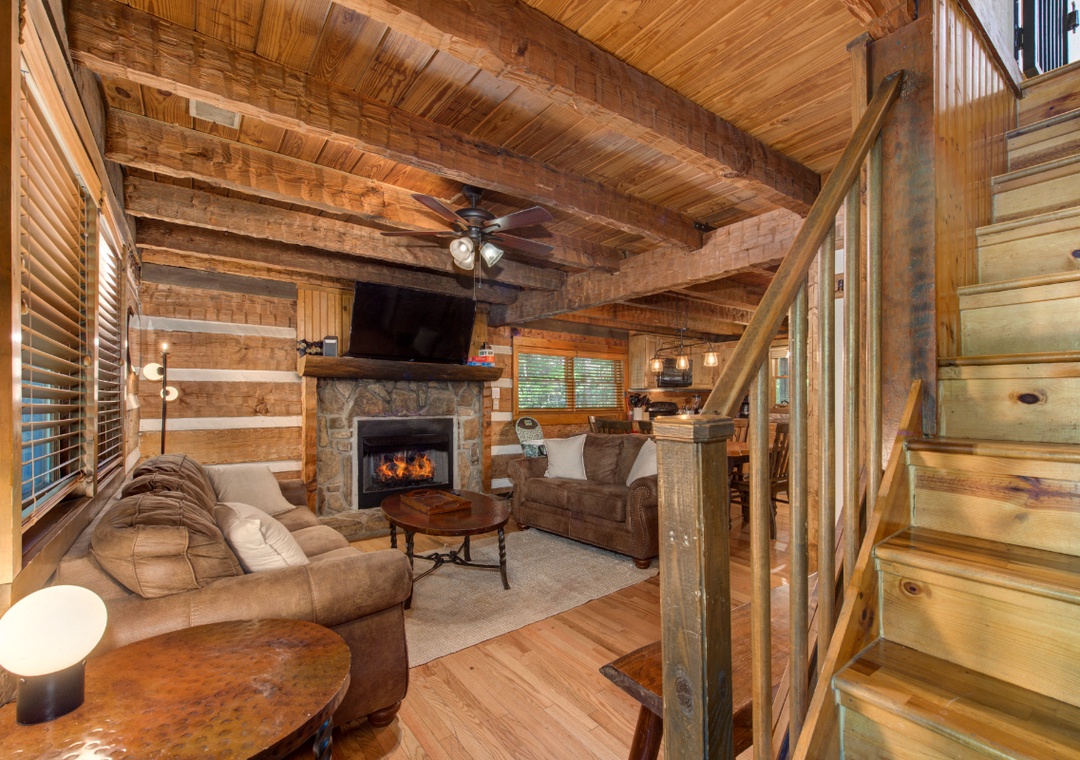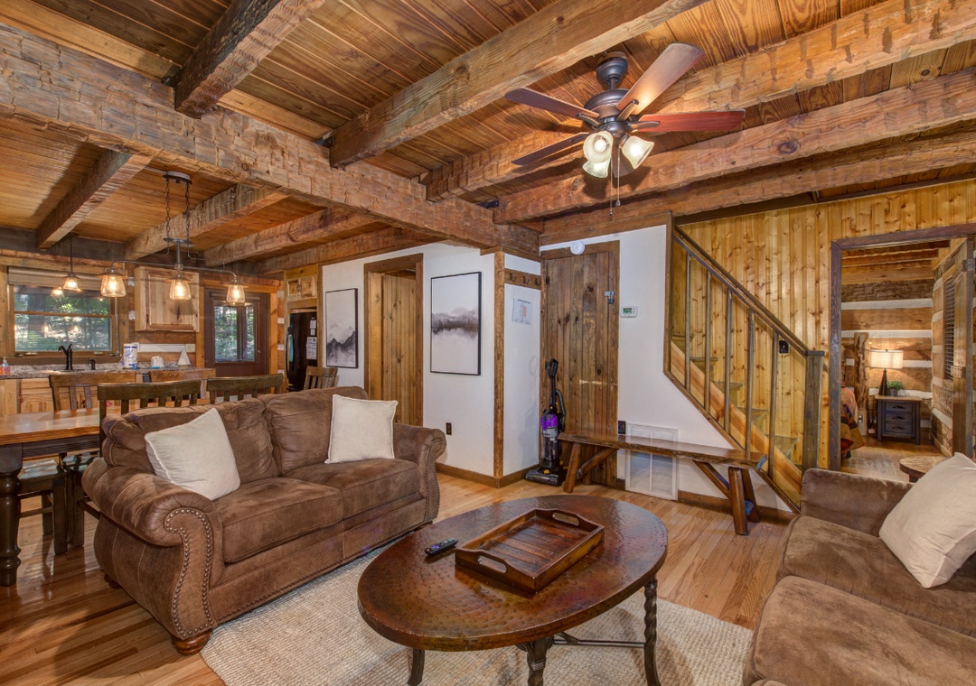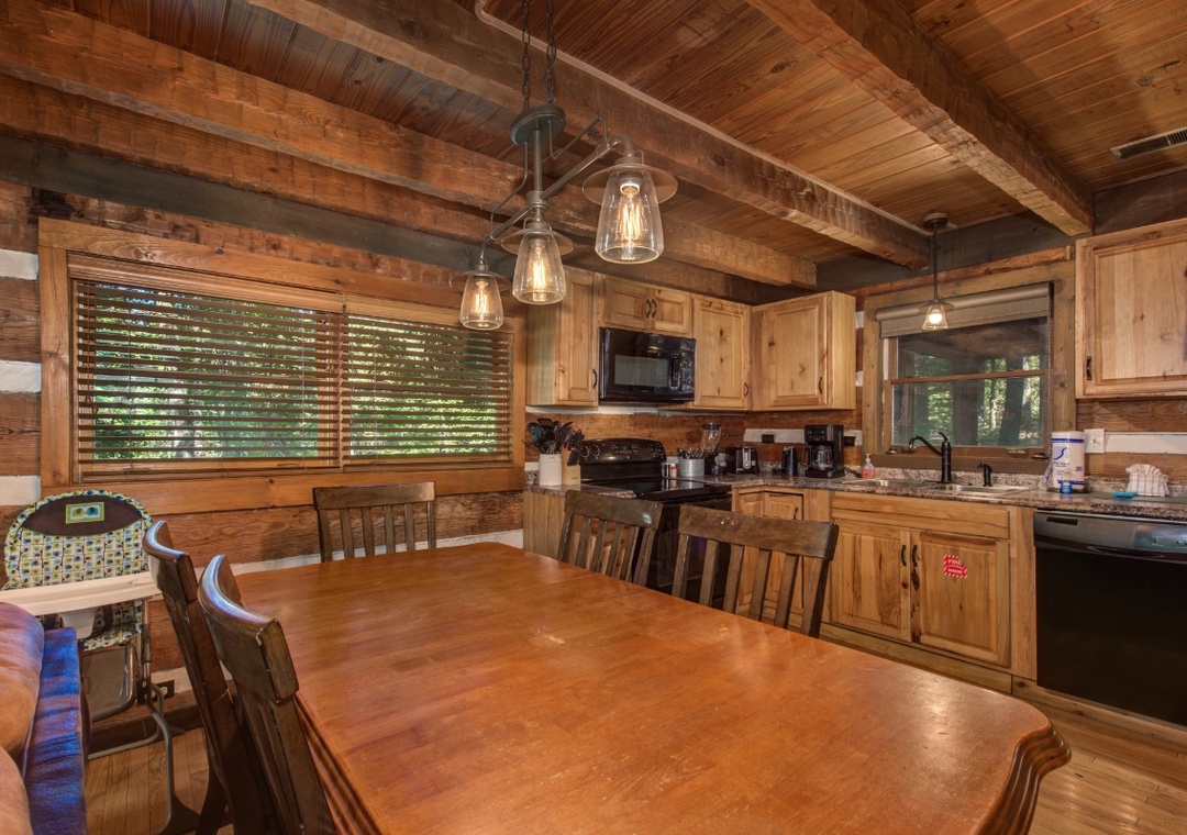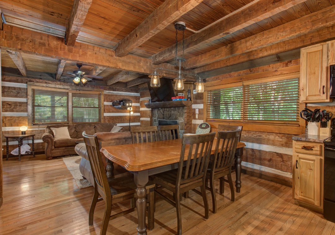The cabin-worthy interior is warm and inviting, accented by rich wood finishes and thoughtful touches that make the space feel both cozy and stylish. The open-concept design allows the living room, kitchen, and dining area to flow seamlessly, creating a natural gathering place for the whole group. The living room features a gas fireplace that adds charm and comfort, while large windows draw in natural light and views of the woods surrounding it. With comfortable seating and a welcoming atmosphere, this area is the heart of the lodge, perfect for conversation, movie nights, or simply enjoying the serenity of the Smokies. Free WiFi is also available throughout the property.