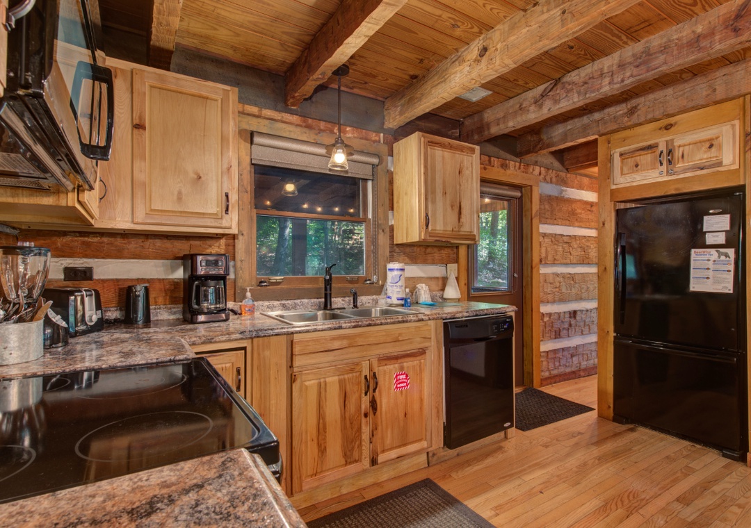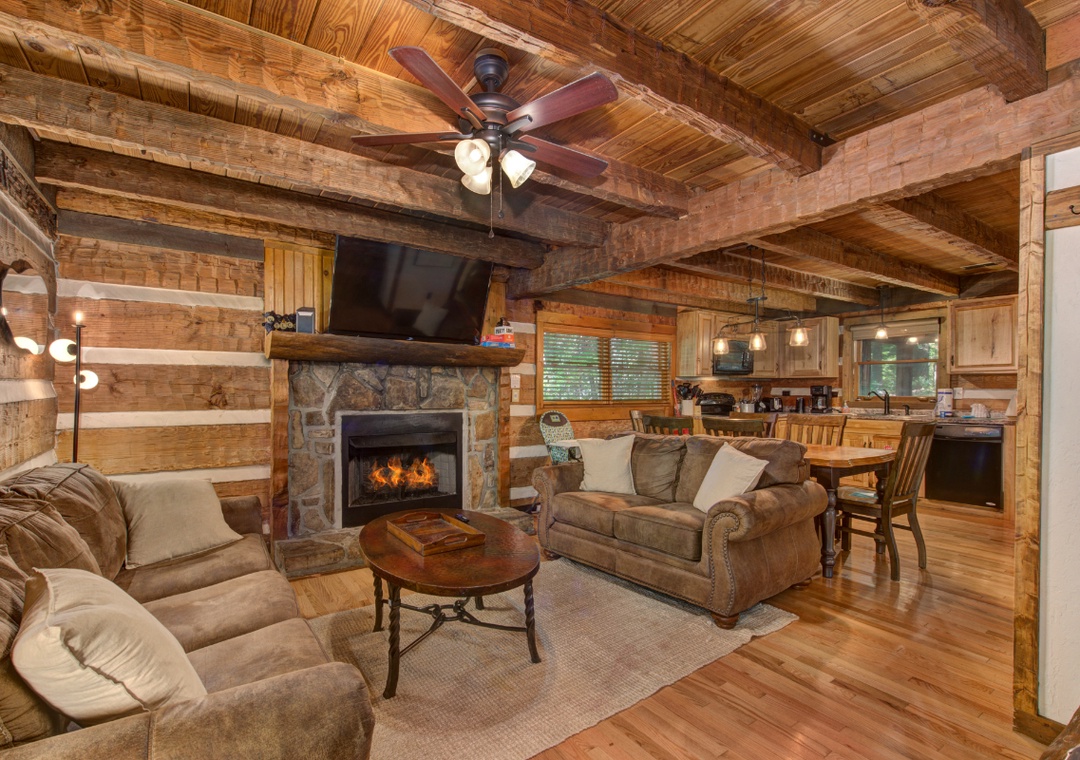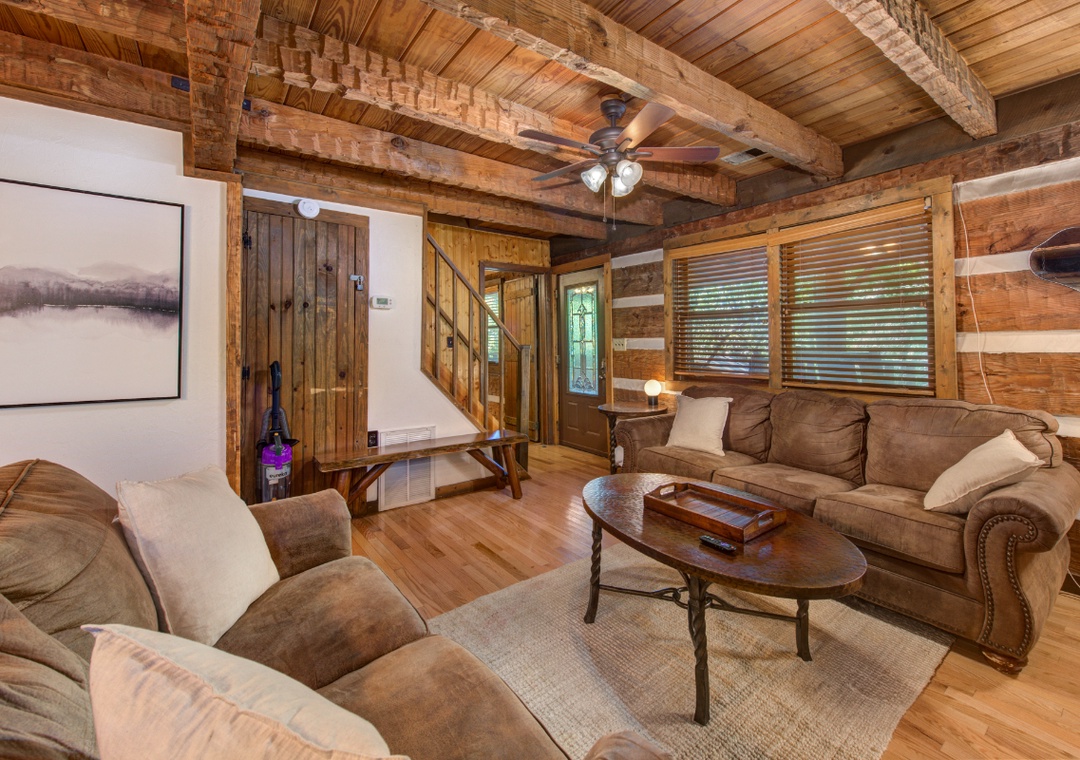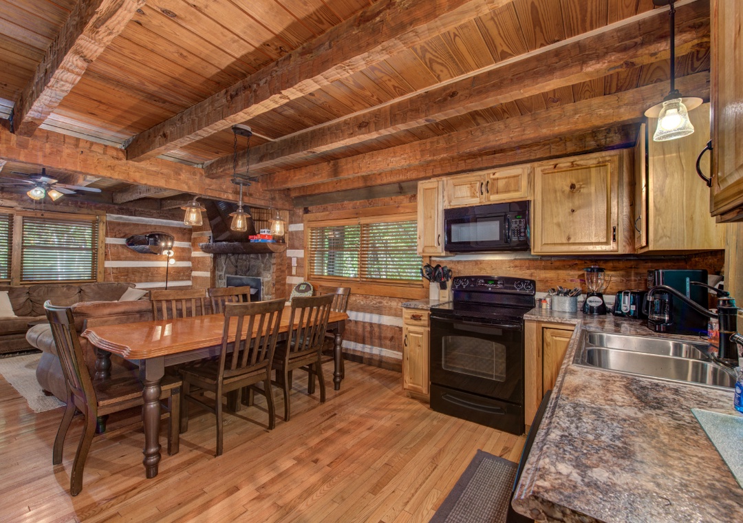 The cabin-worthy interior is warm and inviting, accented by rich wood finishes and thoughtful touches that make the space feel both cozy and stylish. The open-concept design allows the living room, kitchen, and dining area to flow seamlessly, creating a natural gathering place for the whole group. The living room features a gas fireplace that adds charm and comfort, while large windows draw in natural light and views of the woods surrounding it. With comfortable seating and a welcoming atmosphere, this area is the heart of the lodge, perfect for conversation, movie nights, or simply enjoying the serenity of the Smokies. Free WiFi is also available throughout the property.