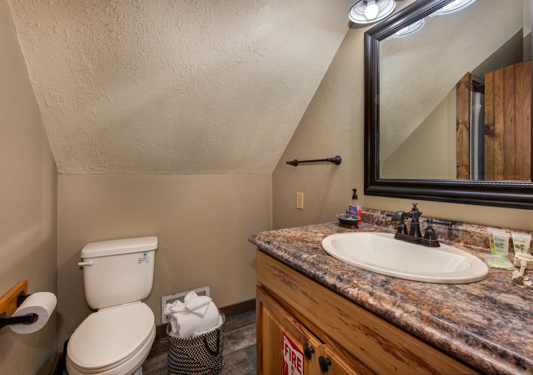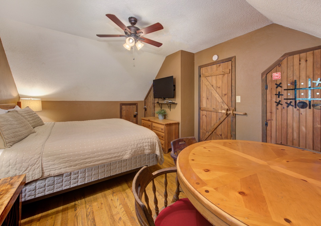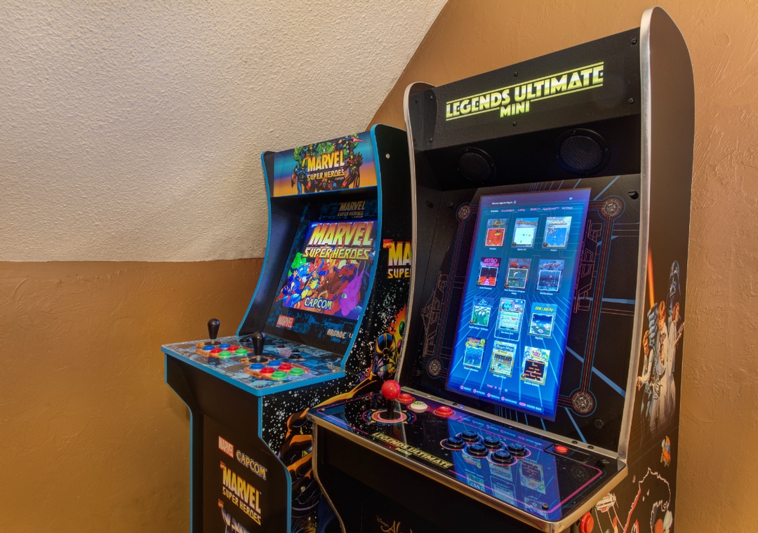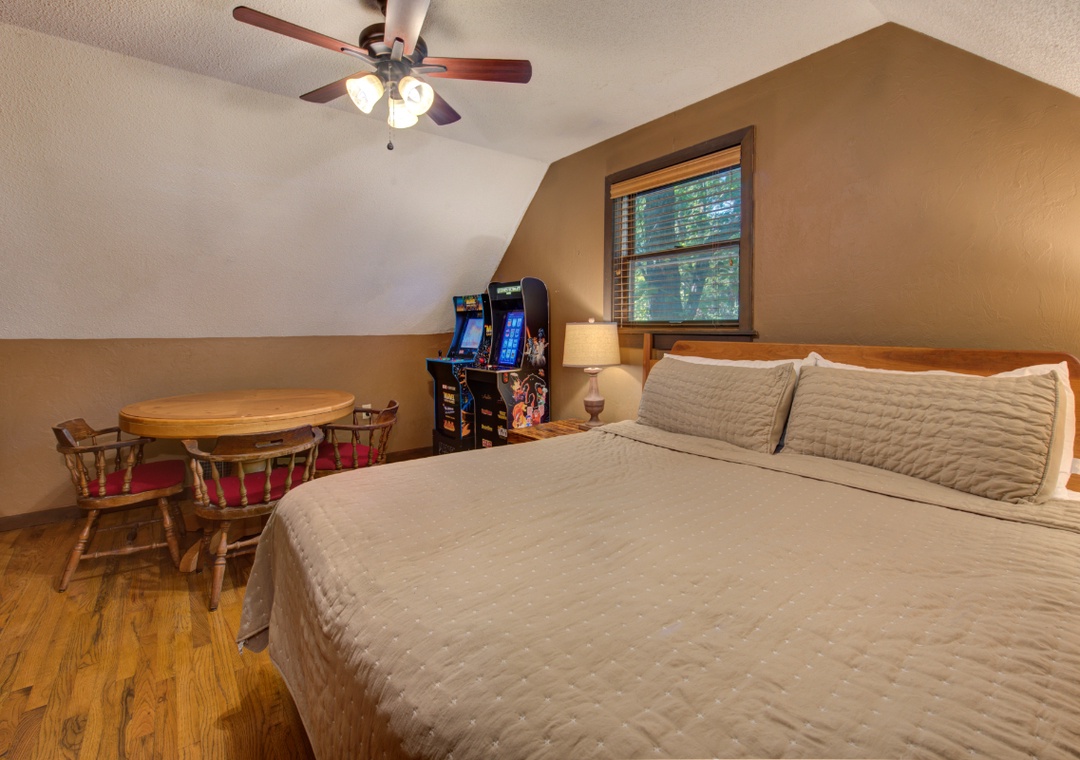 ✔ Bedroom #3 (Upper Level): Inviting Bedroom with a King-sized Bed, 2 Arcades, a Poker Table, and a Flat-screen TV; Access to a Full Bathroom with Stand Up Shower