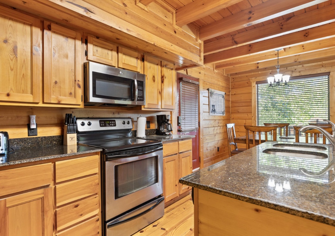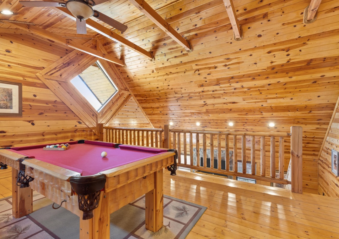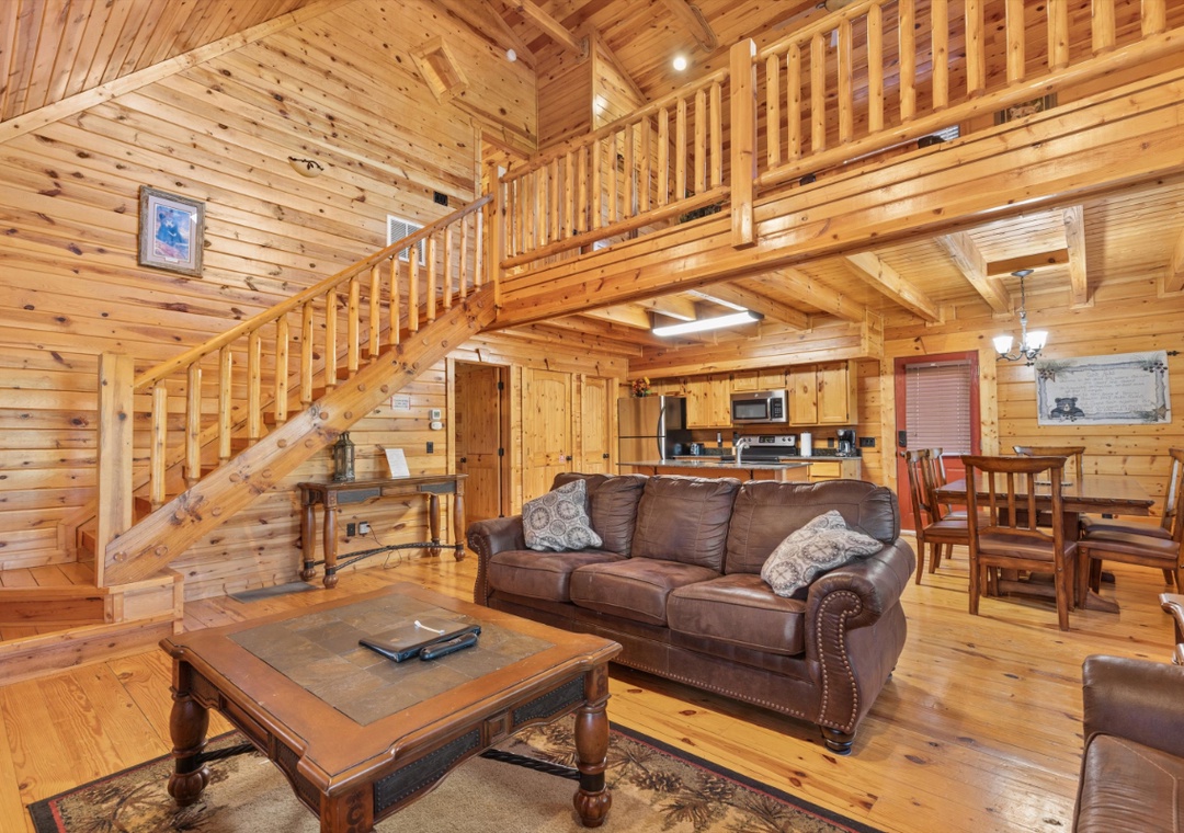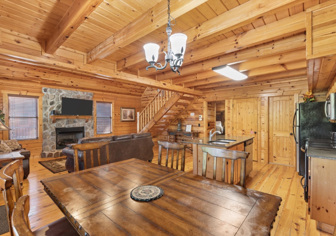 Inside, natural light pours in through large windows, illuminating the warm tones and cozy atmosphere that instantly make you feel at home. The living room is the centerpiece of the main level, offering the ideal spot to relax and recharge. Curl up on the comfortable seating as you enjoy a movie night on the 50" Roku TV, or warm up beside the propane fireplace, which adds a comforting glow on cool mountain evenings. The fully equipped kitchen is just steps away and features ample countertops, modern appliances, and all the essentials you’ll need to prepare home-cooked meals. Head upstairs to the open loft area where a pool table awaits, offering friendly competition after dinner. Free WiFi is also available throughout the property.
