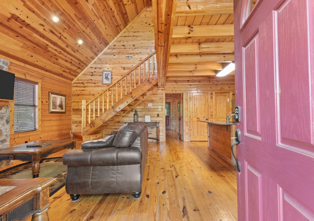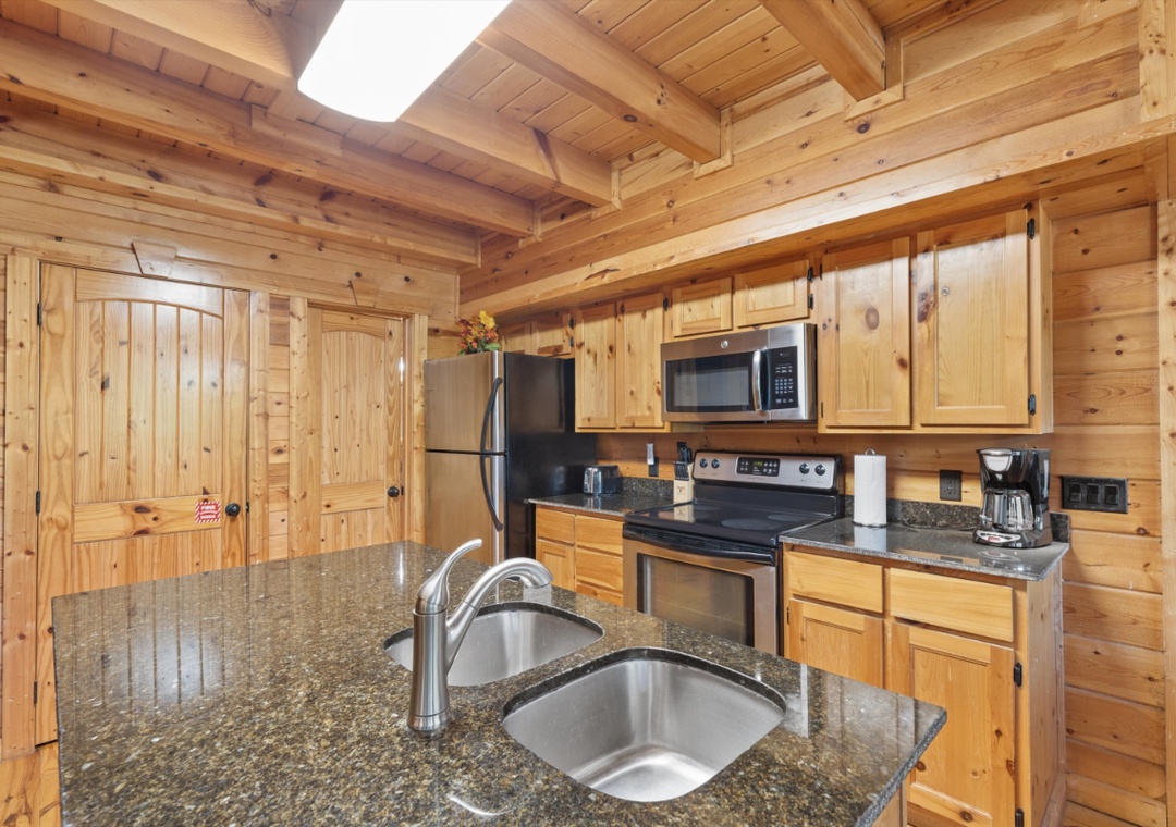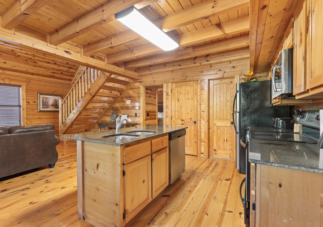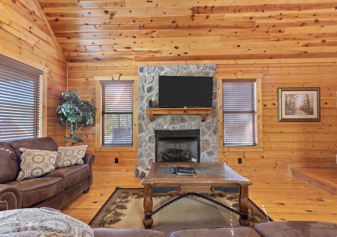 Inside, natural light pours in through large windows, illuminating the warm tones and cozy atmosphere that instantly make you feel at home. The living room is the centerpiece of the main level, offering the ideal spot to relax and recharge. Curl up on the comfortable seating as you enjoy a movie night on the 50" Roku TV, or warm up beside the propane fireplace, which adds a comforting glow on cool mountain evenings. The fully equipped kitchen is just steps away and features ample countertops, modern appliances, and all the essentials you’ll need to prepare home-cooked meals. Head upstairs to the open loft area where a pool table awaits, offering friendly competition after dinner. Free WiFi is also available throughout the property.