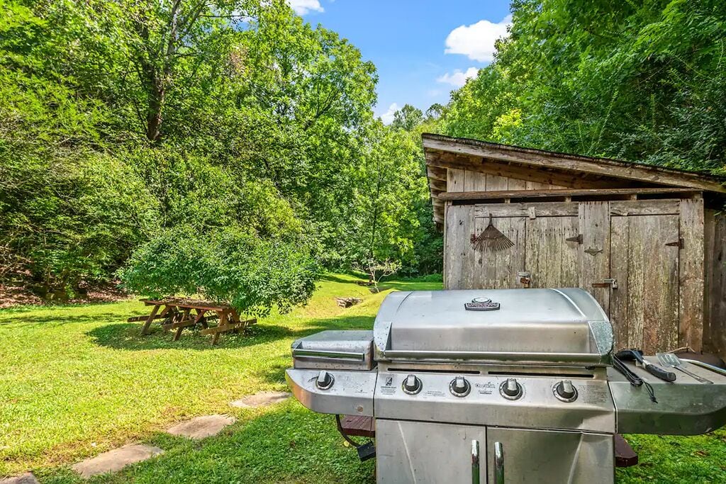 Relaxing outside ambiance with BBQ grill and picnic tables