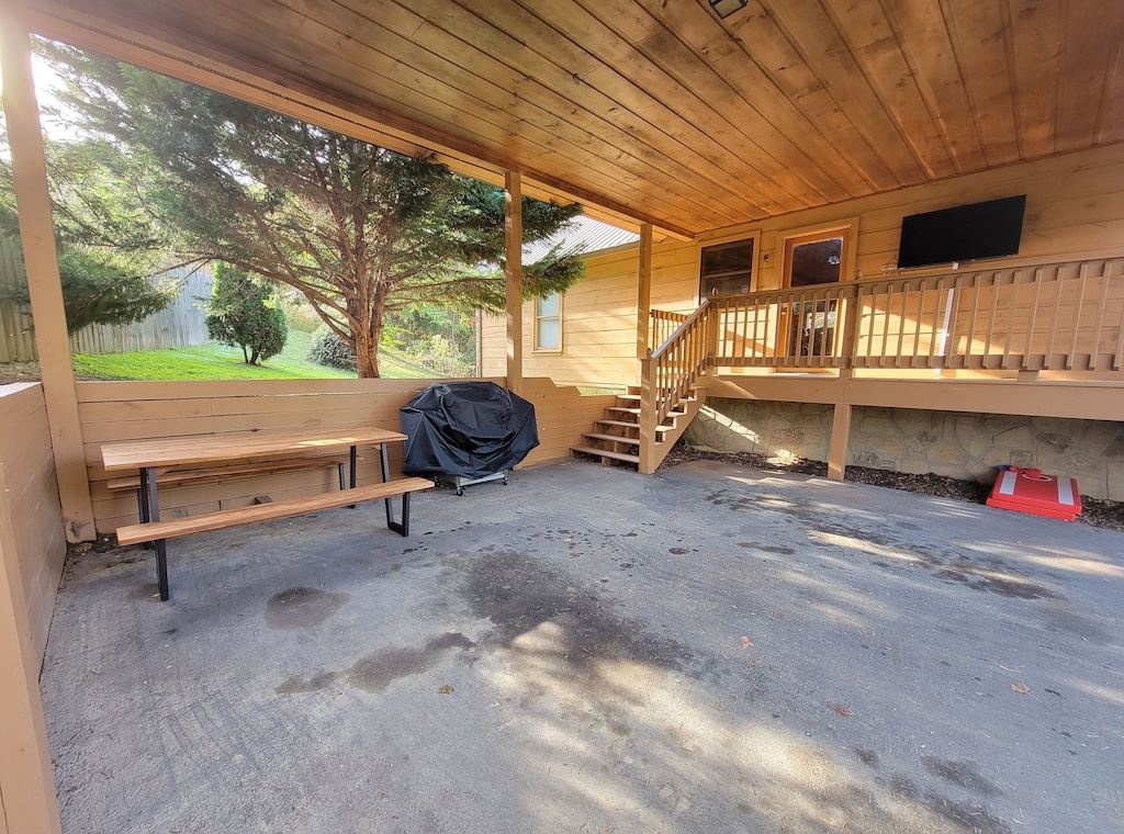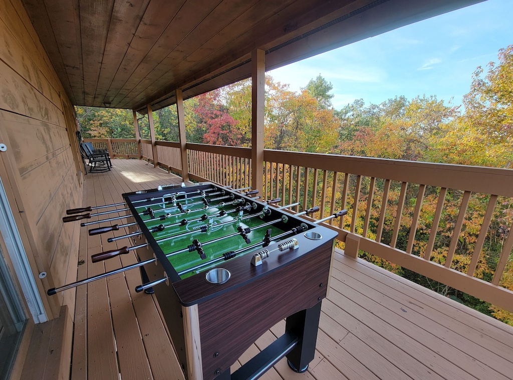 Furnished wrap around deck, rocking chairs, gas grill, hot tub, serene views, large backyard space, foosball table