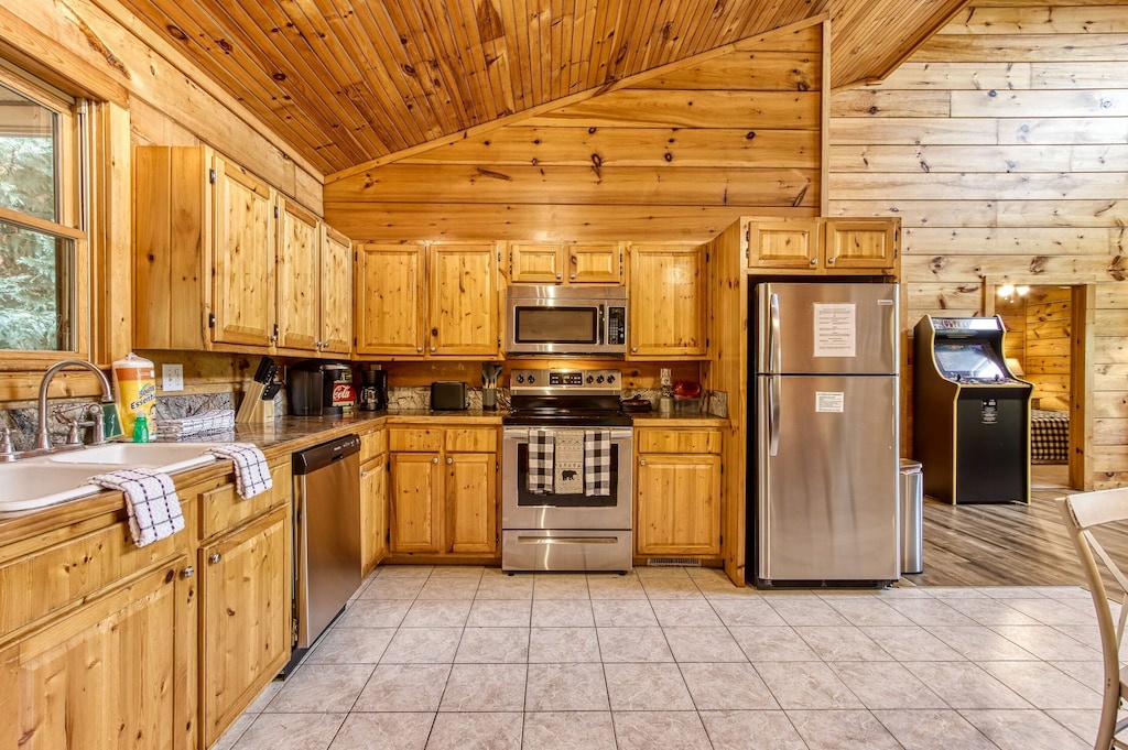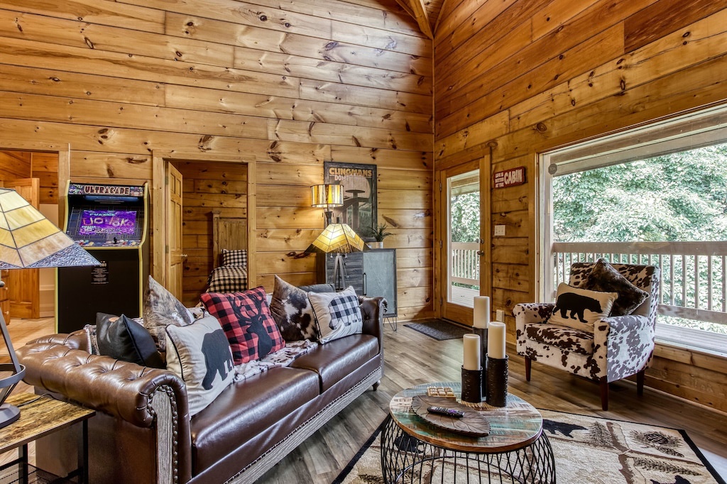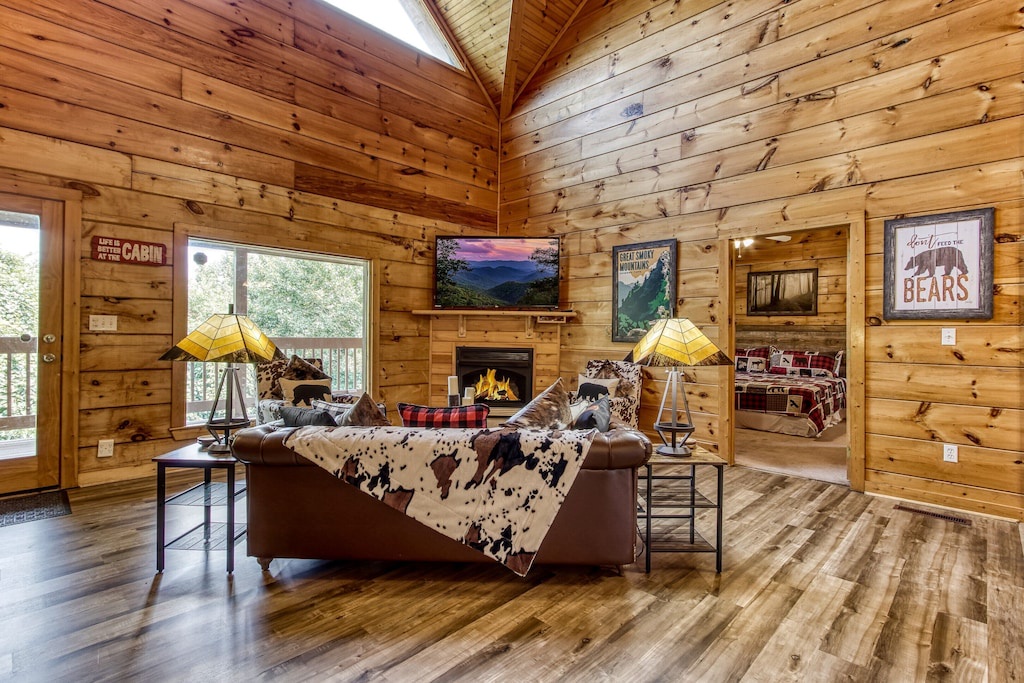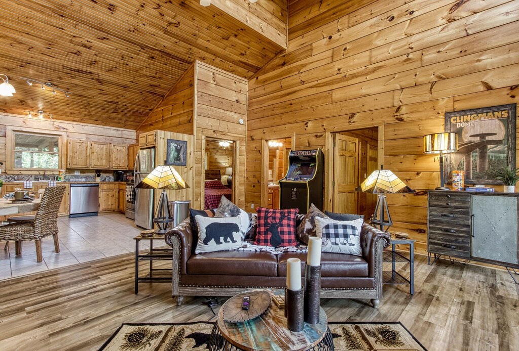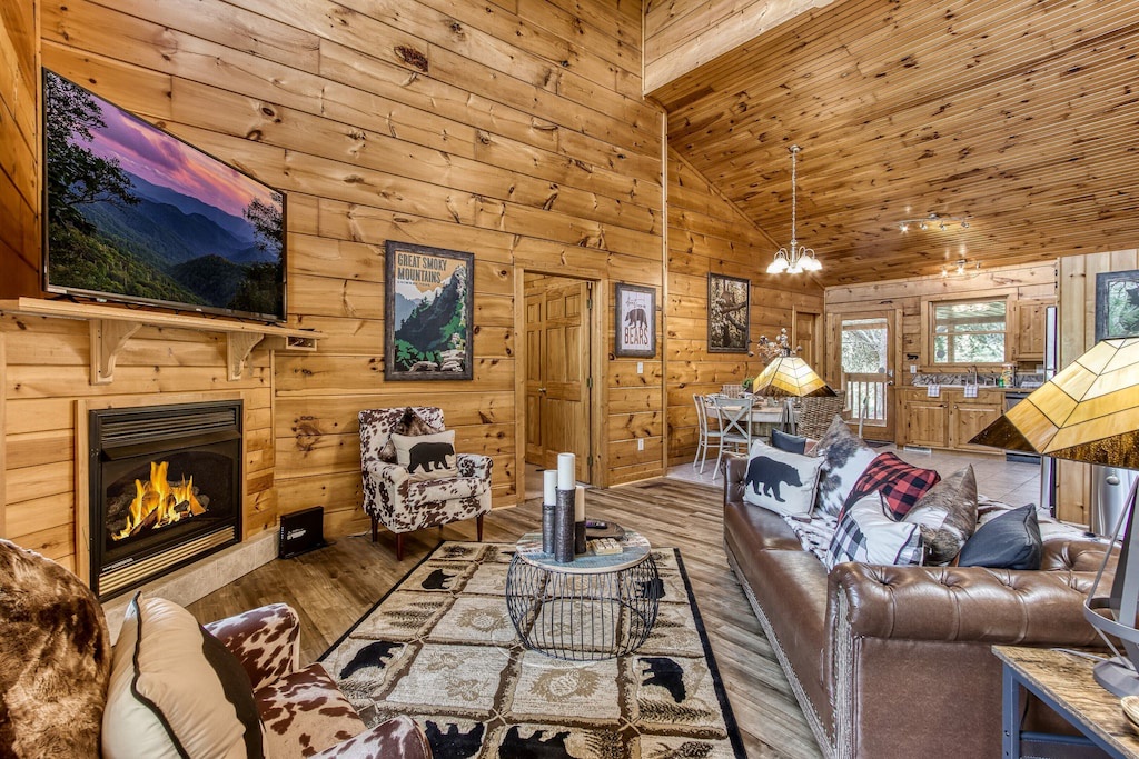 Chic and luxuriously furnished lodge, fireplace, large smart TVs, open living room and high vaulted ceilings, free Wi-fi, arcade