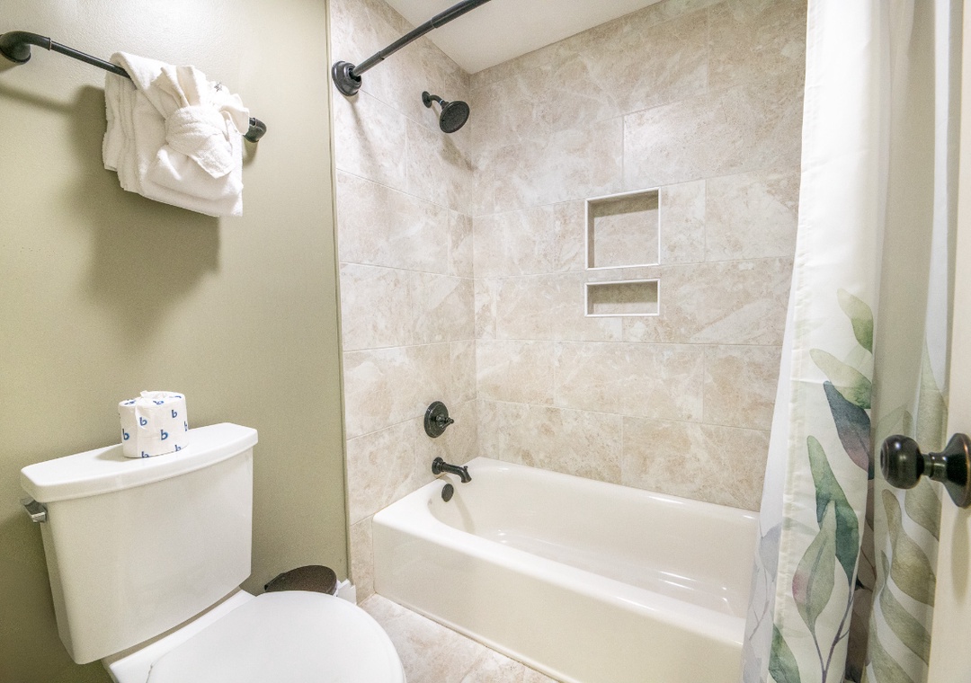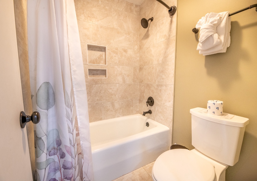 ✔ Bedroom #2 (Mid Level): Spacious Bedroom with a King-size Bed, Flat-screen TV, and Attached Full Bathroom with Shower/Tub Combo