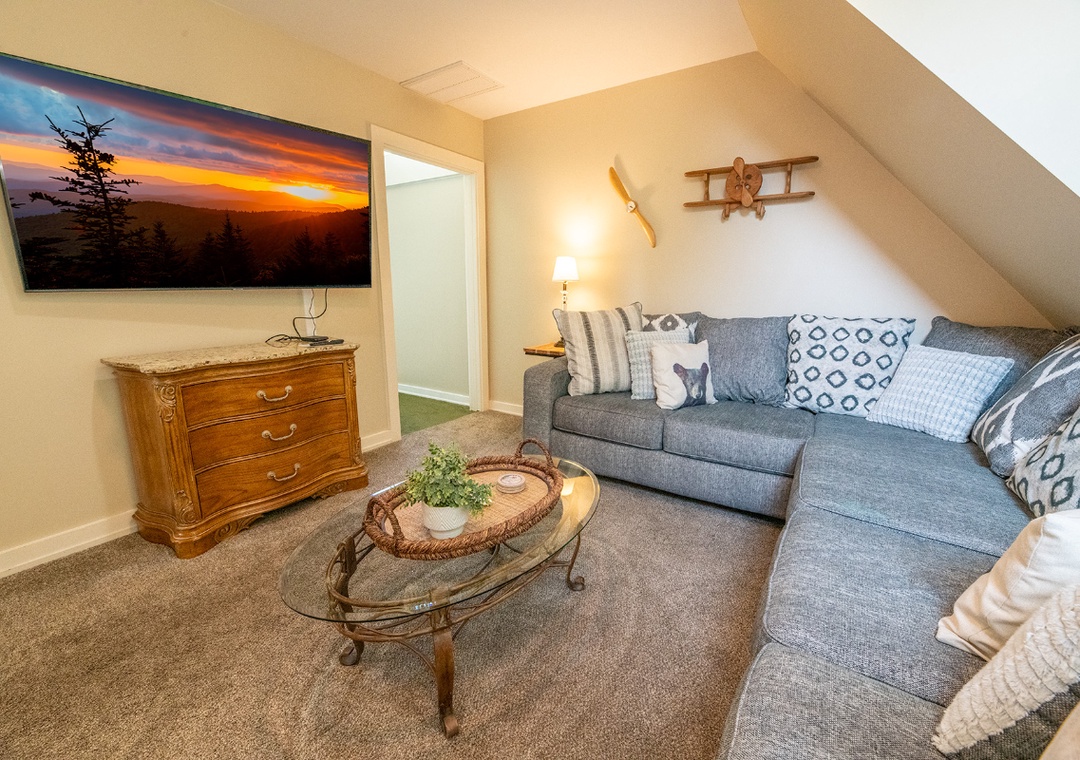 Step inside and be greeted by the warmth and charm of our remarkable chalet. The main level features an open-concept living room with vaulted ceilings and a spectacular double-sided, floor-to-ceiling propane fireplace. This space is perfect for gathering with family and friends, surrounded by the stunning mountain views visible through large windows. The fully equipped kitchen is where culinary adventures await. Ample counter space and modern appliances provide the perfect canvas for your culinary creations, while the adjacent dining area offers a cozy spot to gather and enjoy delicious meals with family and friends. A sunroom on the second floor offers a cozy retreat, bathed in natural light, perfect for quiet mornings or peaceful afternoons. Downstairs, find the game room complete w/ Arcade, Darts, Air Hockey, and Ping Pong Table, and challenge your friends or family to friendly matches that can stretch late into the night. Free WiFi is also available throughout the property so you get connected throughout your stay.