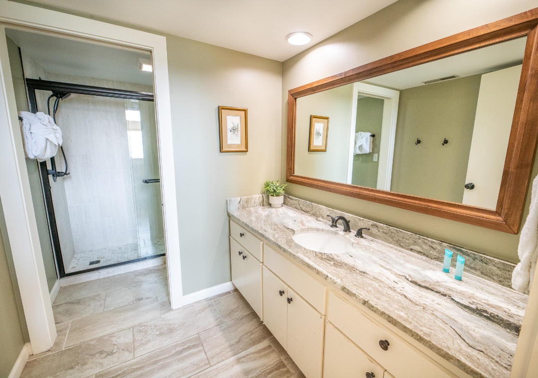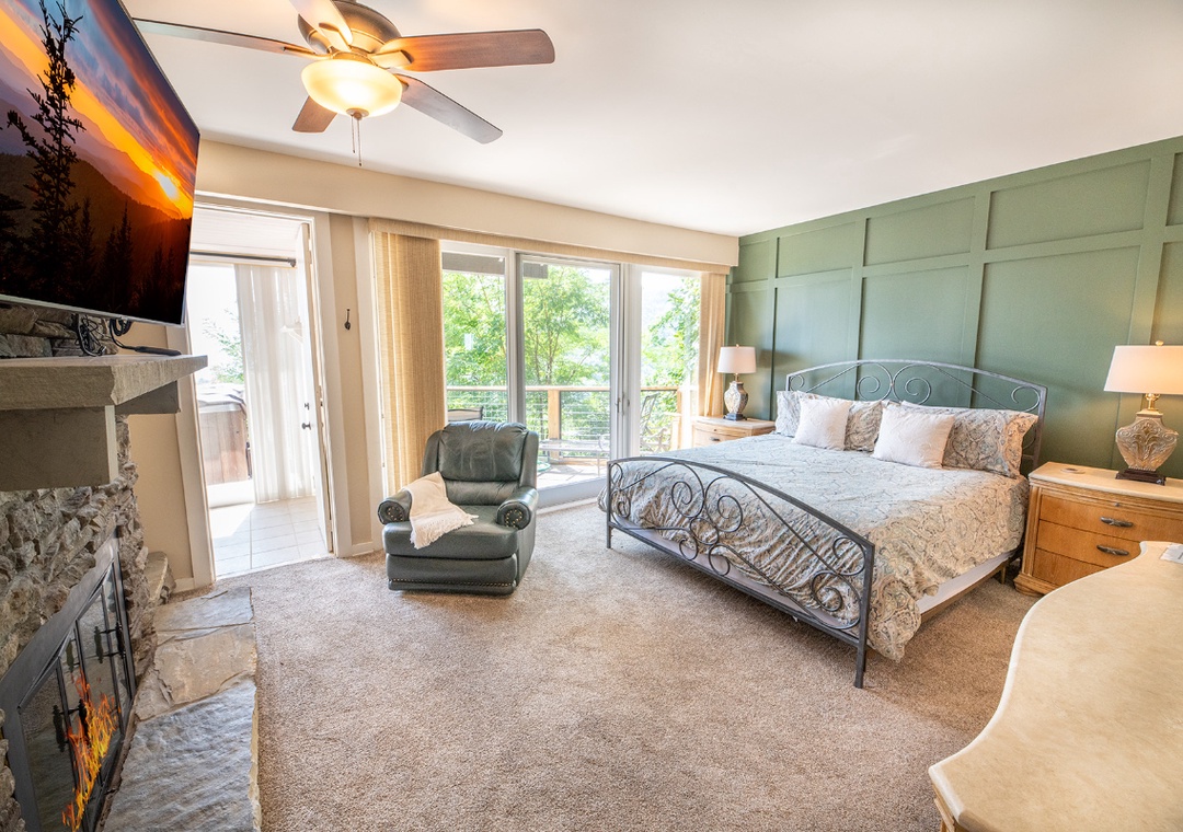 ✔ Bedroom #3 (Mid Level): Comfy Bedroom with a King-size Bed, Flat-screen TV, and Attached Full Bathroom with Shower/Tub Combo