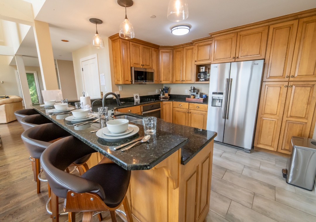 The heart of the home on the third level, the kitchen, is a chef’s dream. Featuring upgraded stainless steel appliances, this fully equipped kitchen offers everything needed to prepare gourmet meals for your group. With ample counter space and modern amenities, cooking here is a delight. The adjacent dining area provides ample seating, allowing everyone to enjoy meals together. You can also step outside to the expansive furnished deck, where you can grill dinner while soaking in the fresh mountain air and enjoying the panoramic views.