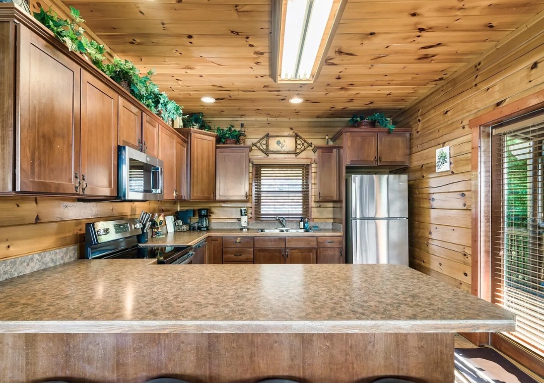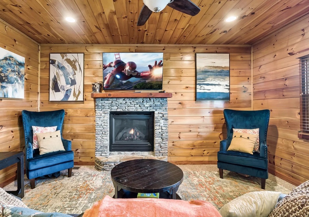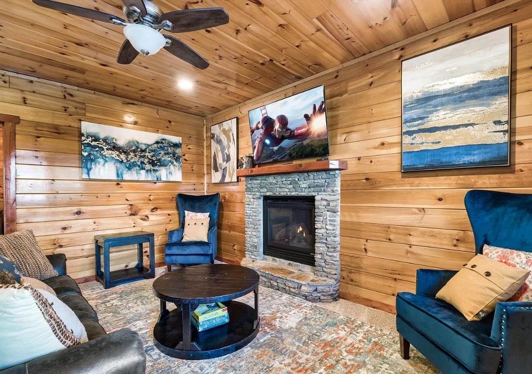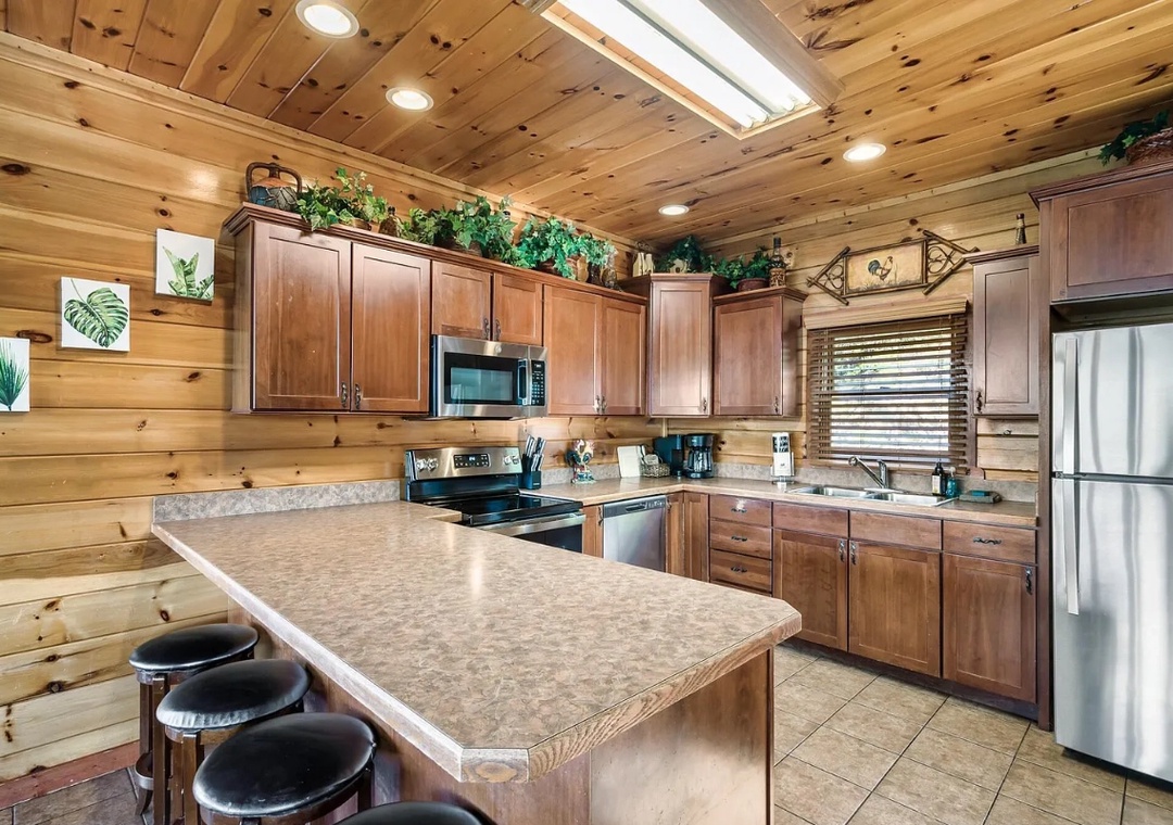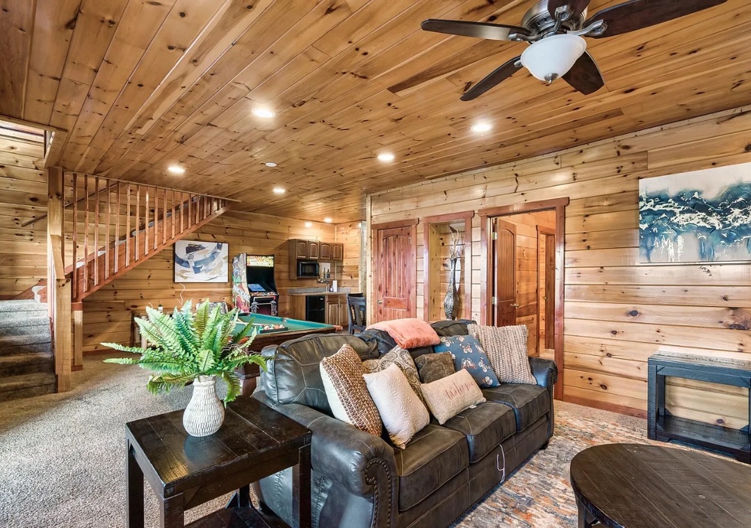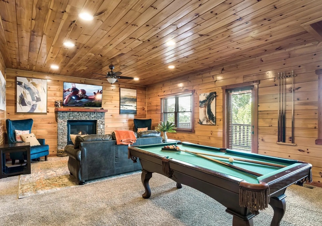The lodge features two fireplaces – one in the main living room and the other in the game room – creating cozy corners to gather and relax, whether you're catching up with loved ones, watching a movie on the smart TV, or curling up with a book. The living room offers plenty of comfortable seating, including a sleeper sofa for extra guests, and is styled with warm, mountain-inspired décor. The kitchen is fully equipped with stainless steel appliances, sleek countertops, and all the essentials, so you’ll have everything you need to prepare meals with ease. The game area is a highlight, where you’ll find entertainment for all ages, including a pool table, arcade games, and ample space to kick back and enjoy some friendly competition. Free WiFi is also available throughout the property.