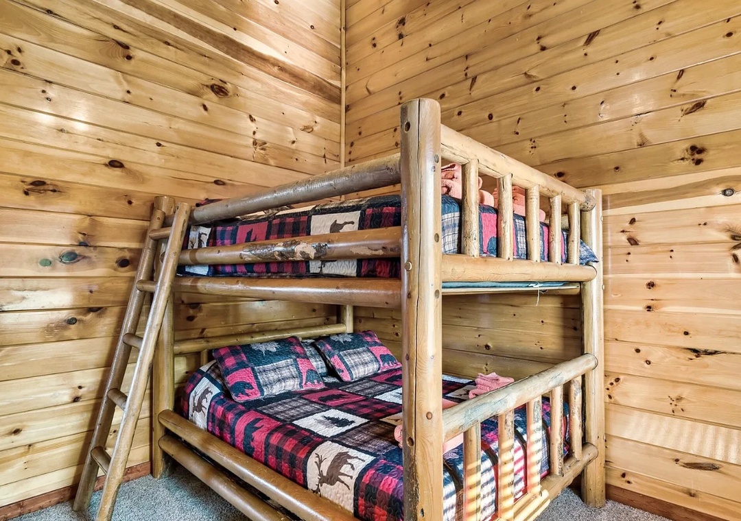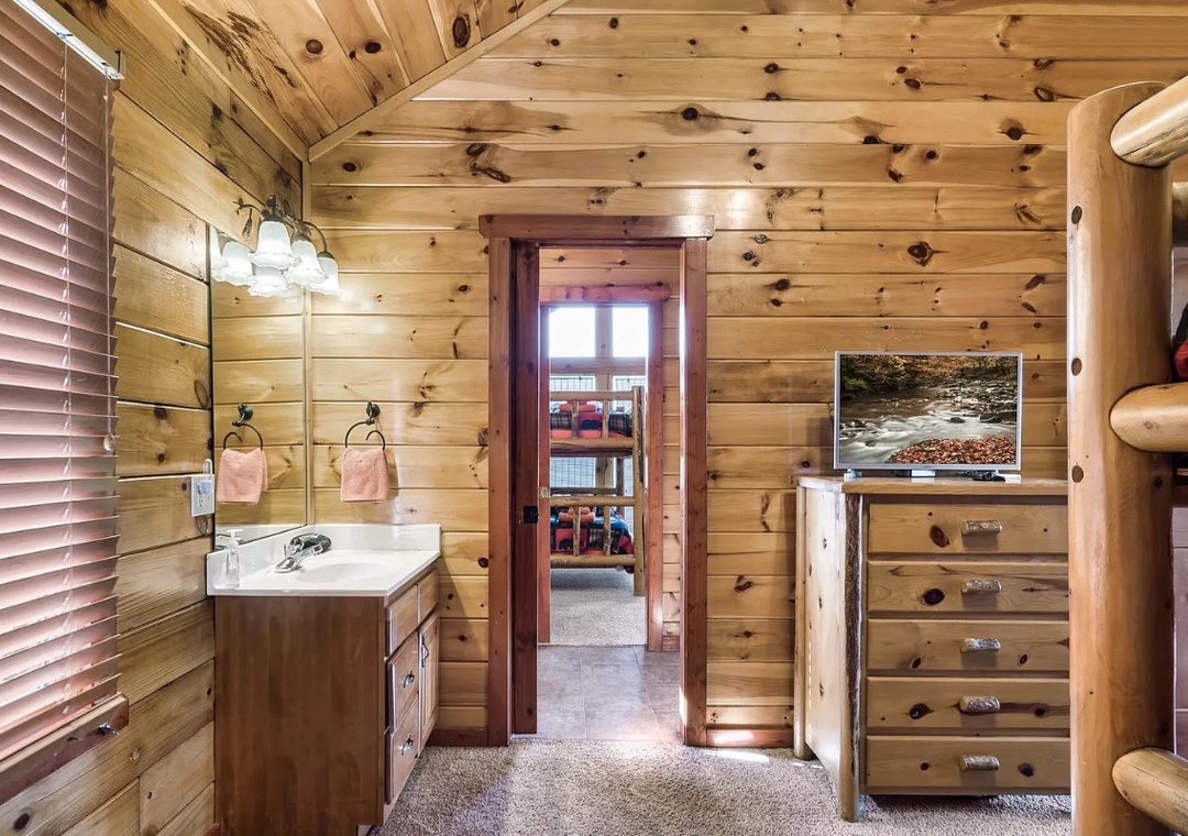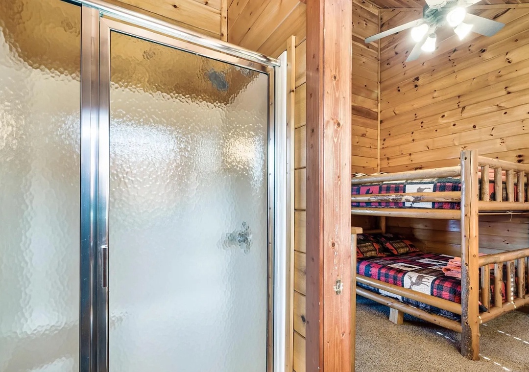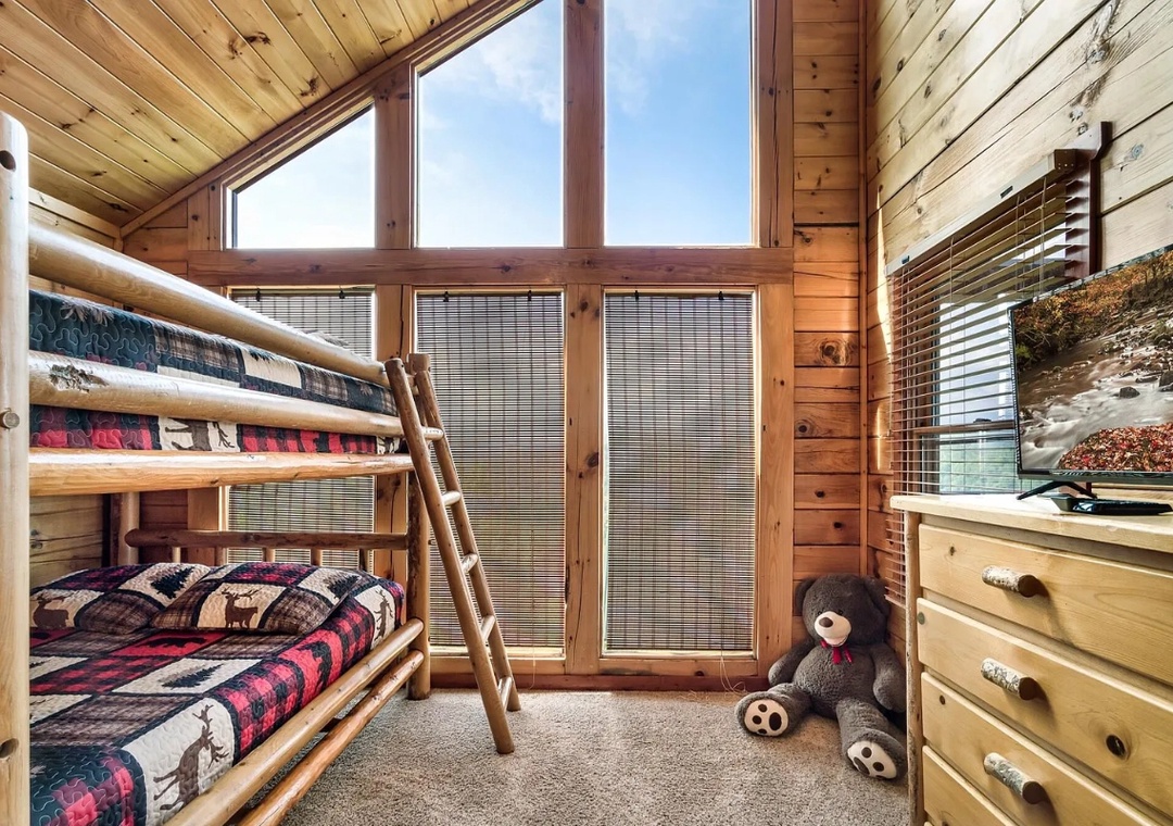 ✔ Bedroom #4 (Upper Level): Inviting Bedroom with a Queen-over-Queen Bunk Bed and Flat-screen TV, Access to a Full Bathroom with Stand-Up Shower