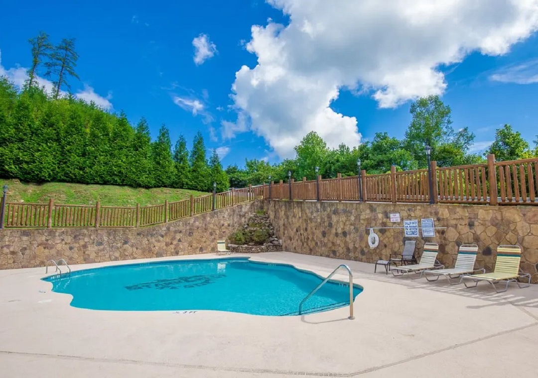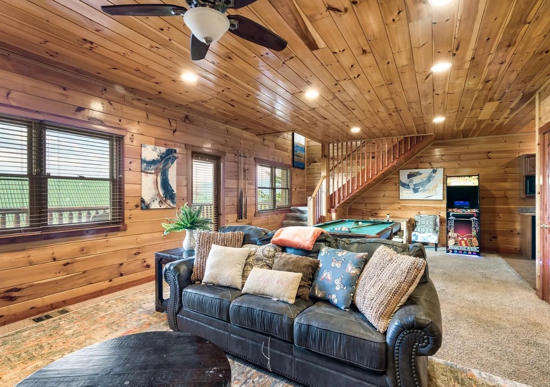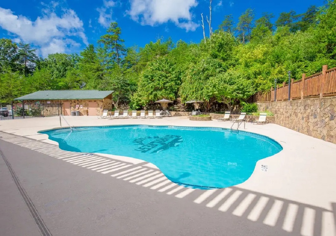 game room, where guests can challenge each other to a game of pool or dive into the nostalgia of a classic arcade setup. This vibrant space is designed to bring everyone together for friendly competition and hours of fun. For a more laid-back experience, head to the lower-level back deck, where a private hot tub awaits. Surrounded by the quiet of the mountains, this inviting space lets you soak and unwind with stunning views as your backdrop. Outside, you’ll find additional options for enjoying time together. For those staying during warmer months, the resort’s seasonal community pool offers another layer of fun. Located at the beginning of the resort, the pool area gives you a place to cool off, lounge, and maybe meet some fellow travelers. It’s a fantastic bonus for sunny days, adding even more variety to your options for outdoor enjoyment.
