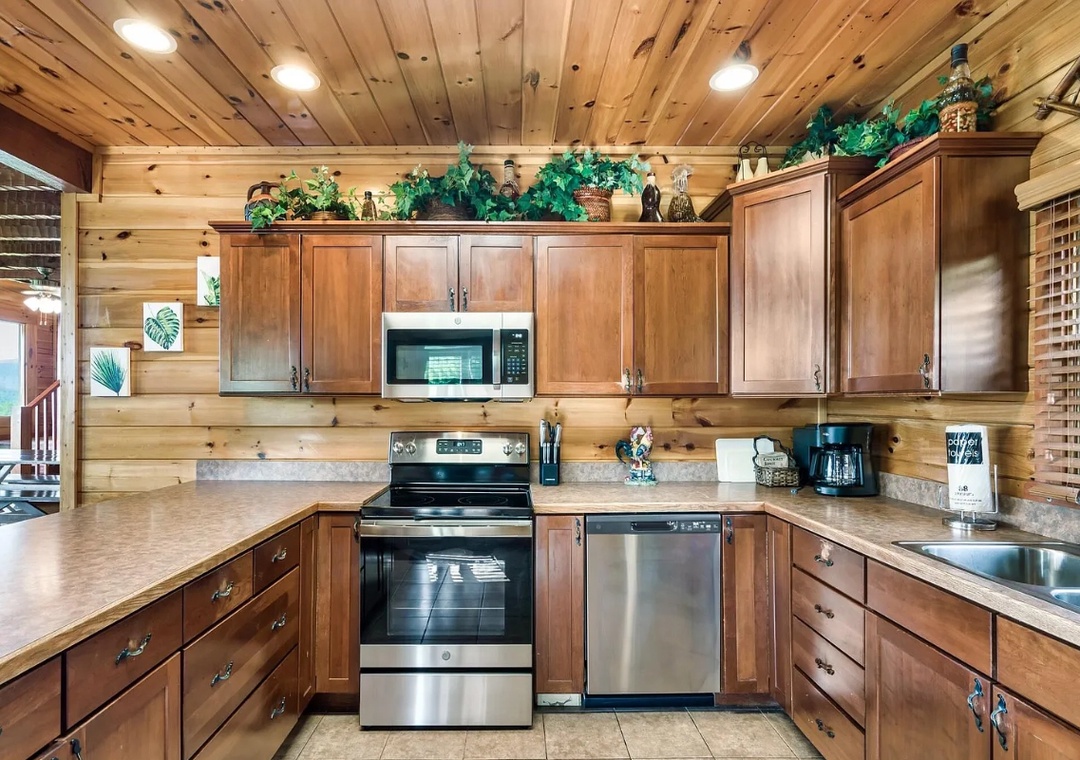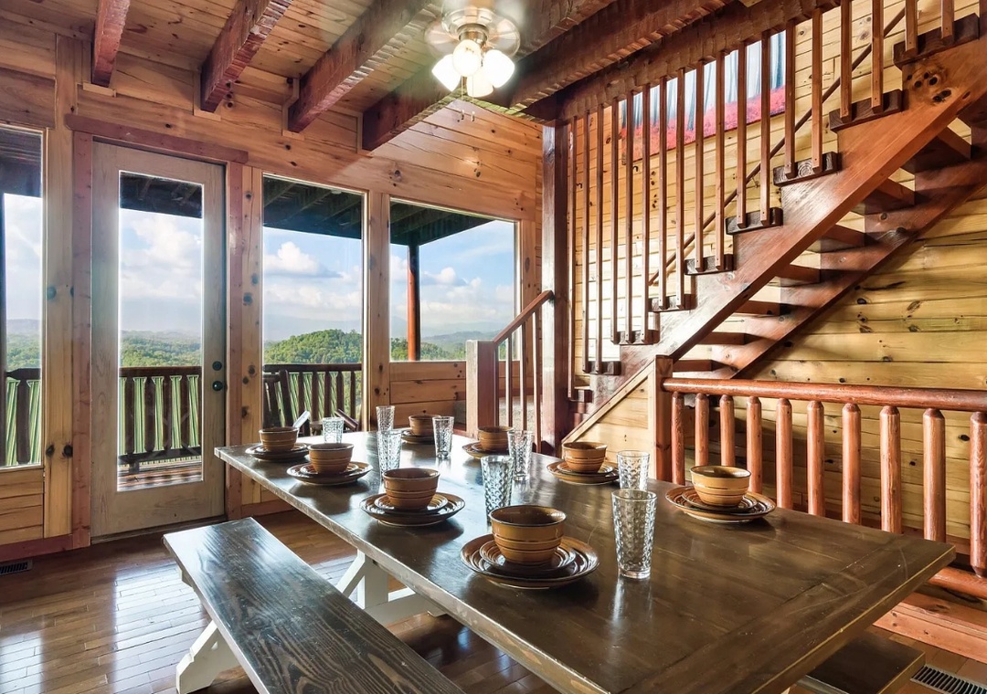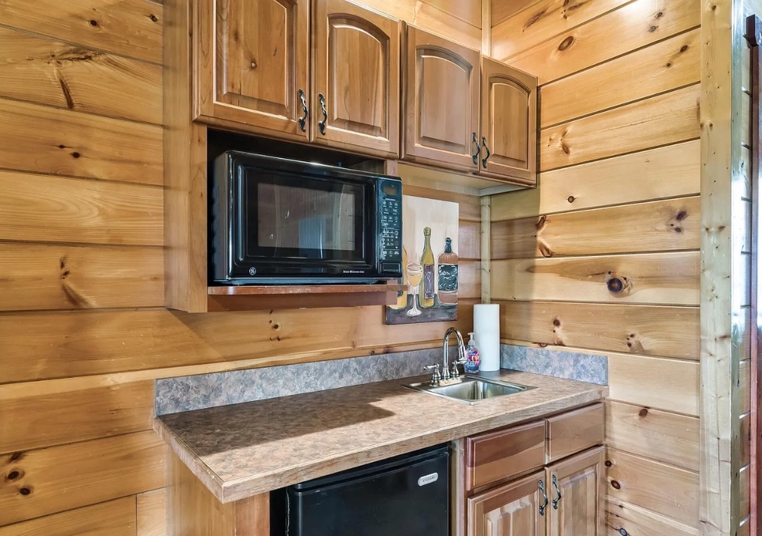 The gourmet kitchen boasts modern amenities making it easy to prepare delicious meals for your family or friends. Well-appointed with a full-sized refrigerator, dishwasher, stove, microwave, and other kitchen appliances perfect for making breakfast, lunch, or dinner throughout your stay! All pots, pans, glasses, plates, silverware, etc. are also there for you! Gather around the wooden dining table to share stories and laughter as it invites you to savor each bite while taking in the natural beauty of the surroundings. For those who enjoy their meals outdoors, our lodge’s al fresco dining area offers an unforgettable experience. Here, you can savor your meals surrounded by fresh mountain air and sweeping views of the Smokies.