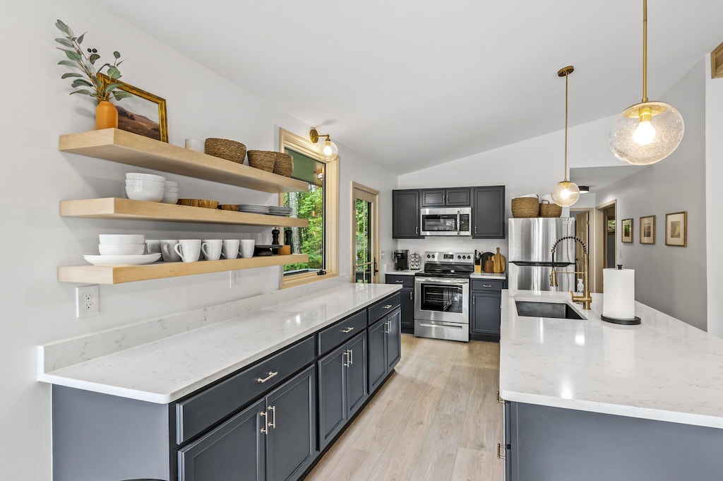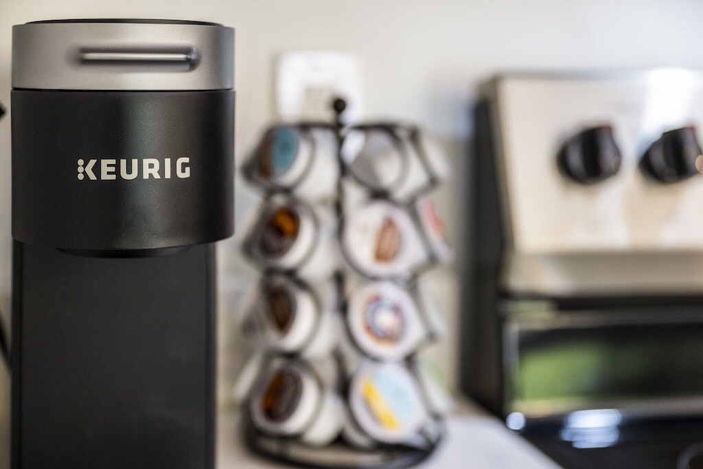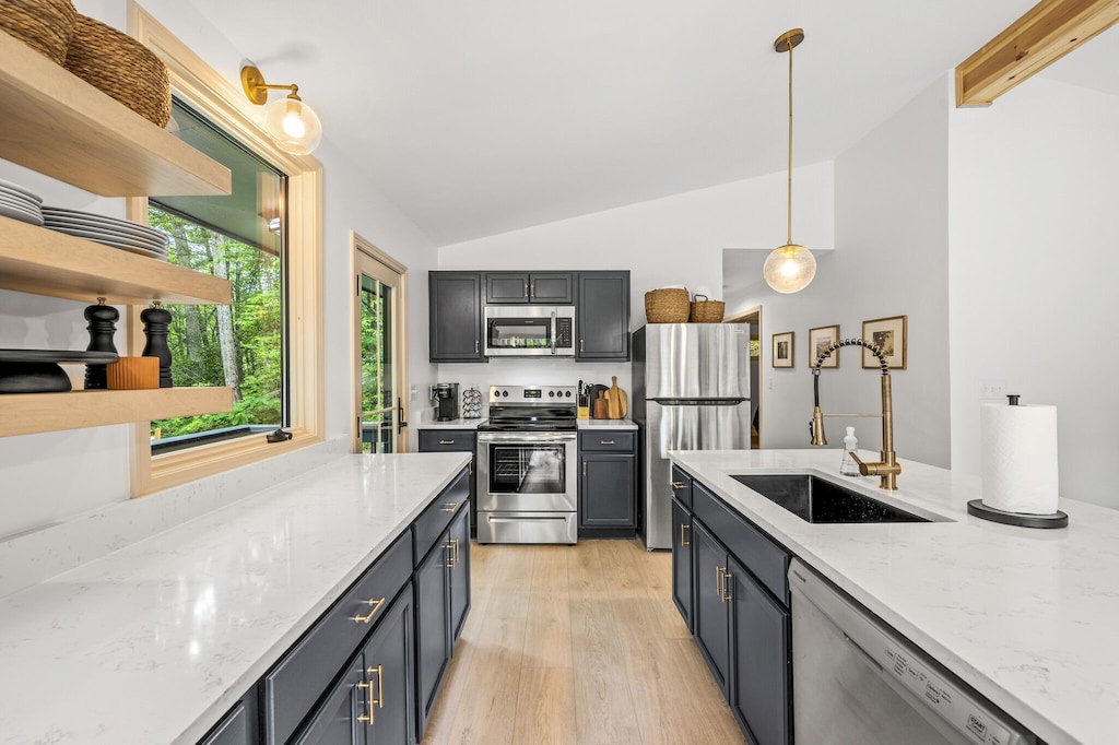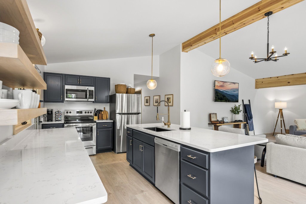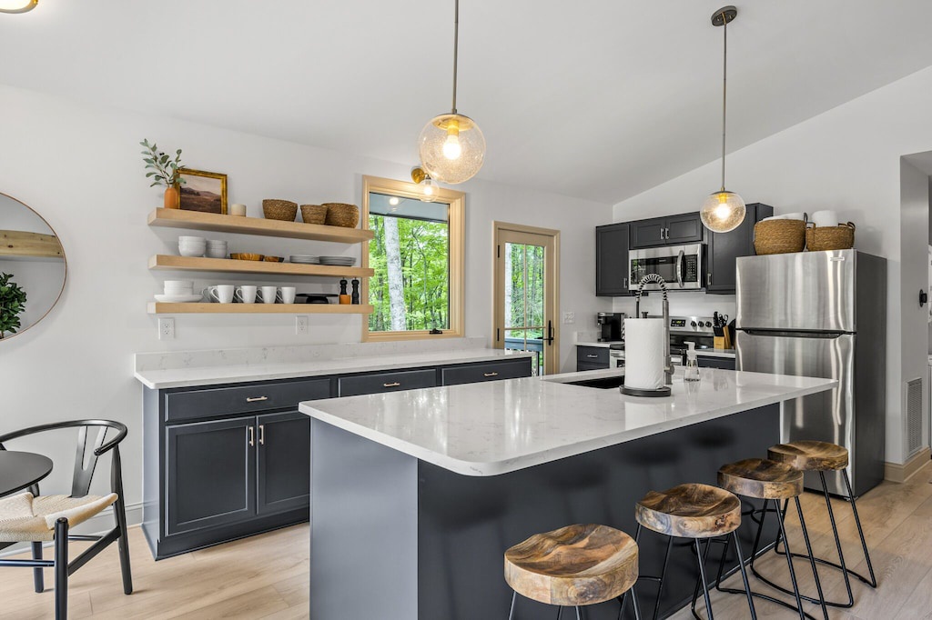 Our home’s open-concept design seamlessly flows into the well-appointed kitchen, where culinary delights come to life. Sleek countertops and major appliances invite your inner chef to create culinary masterpieces. Complete with a full-sized refrigerator, dishwasher, stove, microwave, and other kitchen appliances perfect for making breakfast, lunch, or dinner throughout your stay! Prepare delicious meals and gather around the breakfast bar, where stories and laughter are shared over hearty feasts. Or enjoy your meal outside, while taking in the gorgeous views!