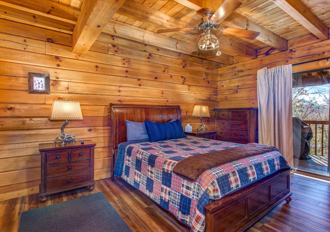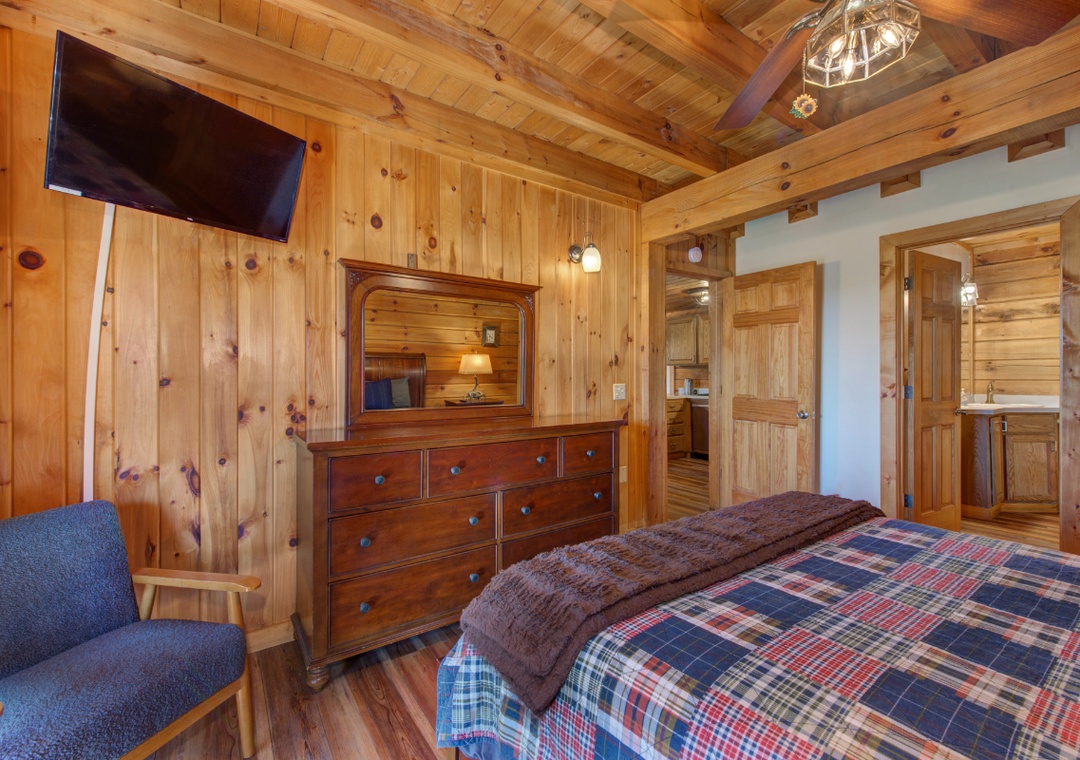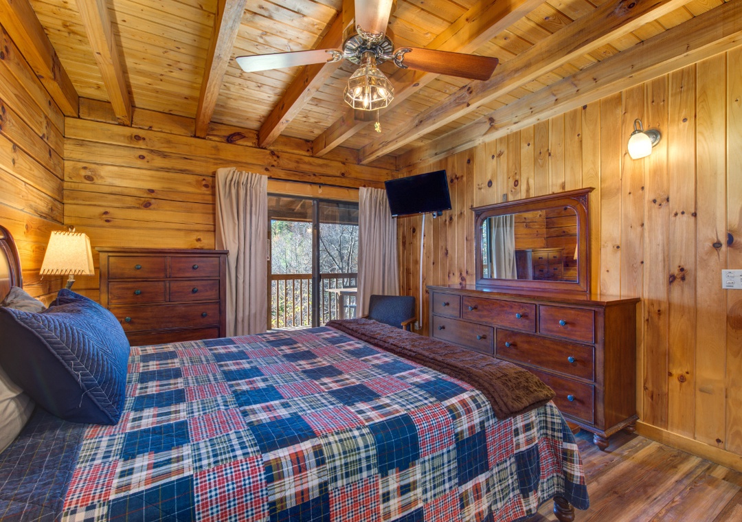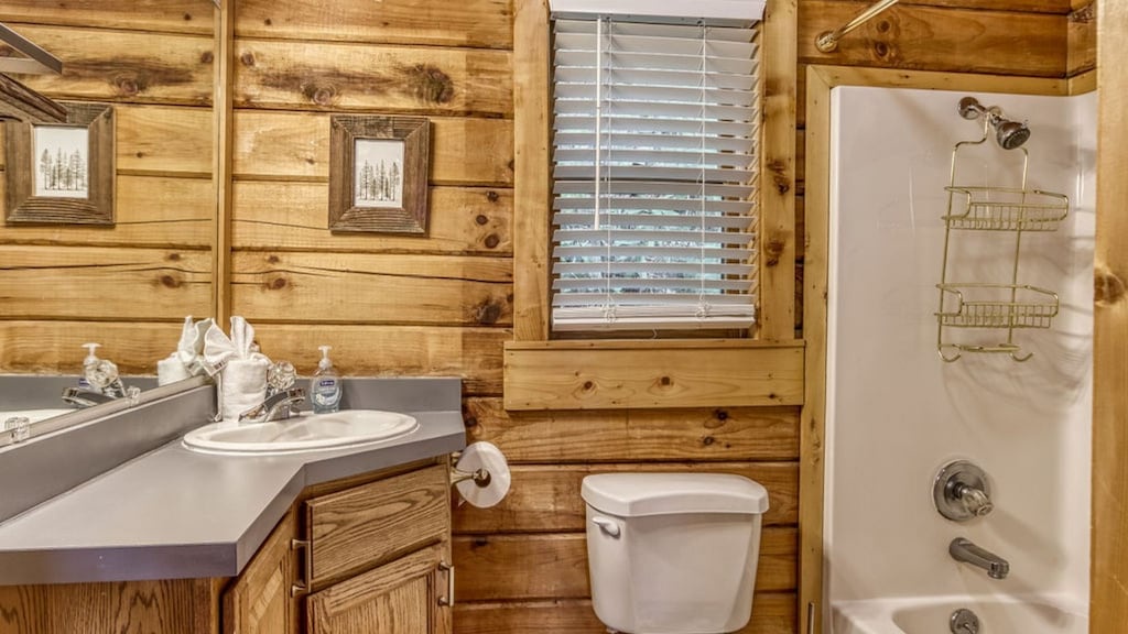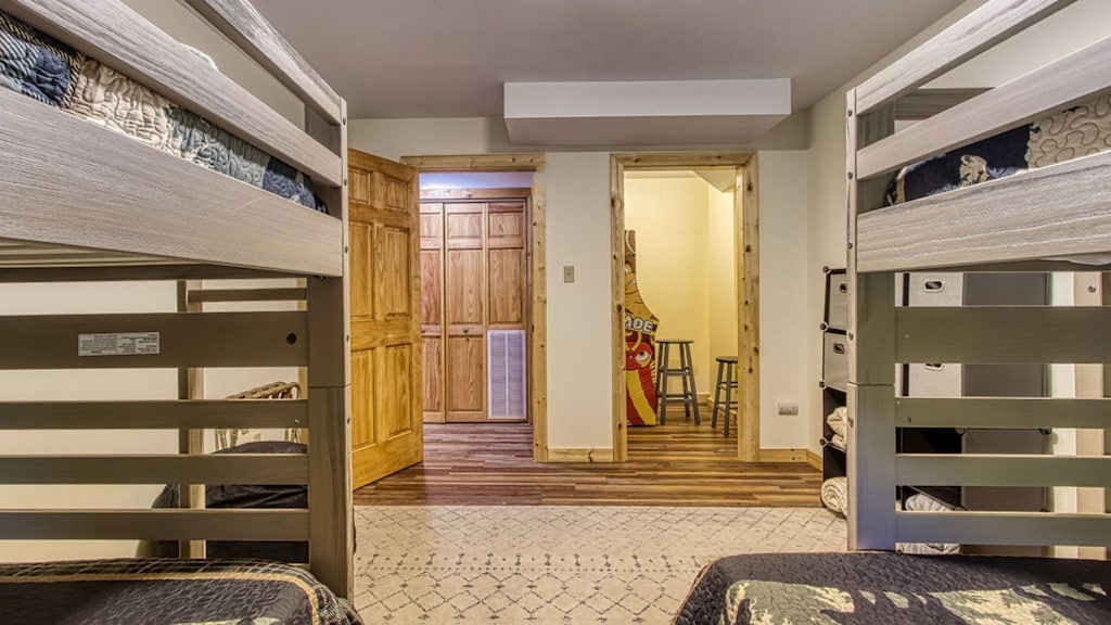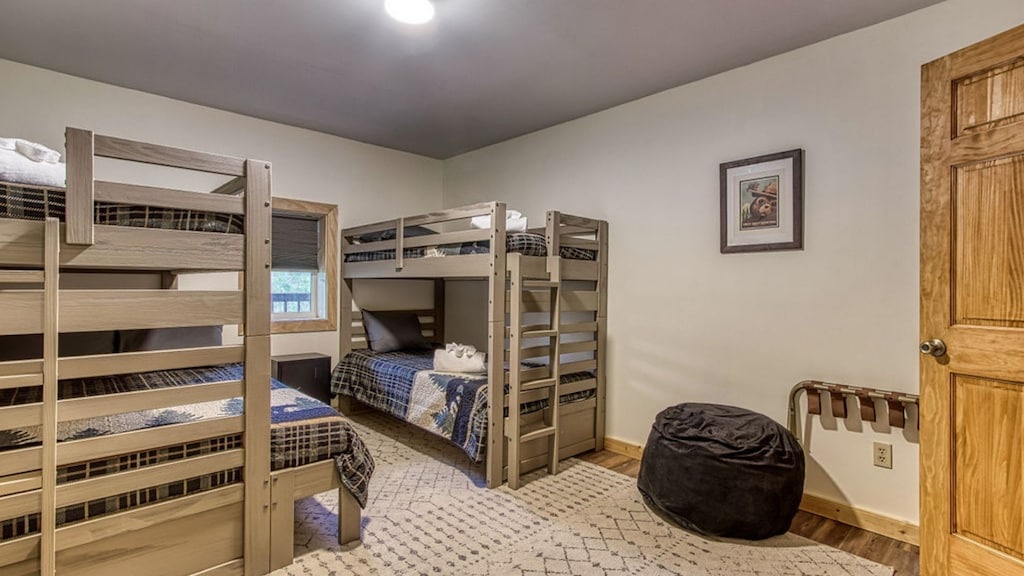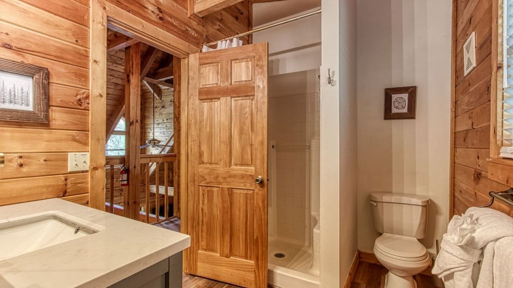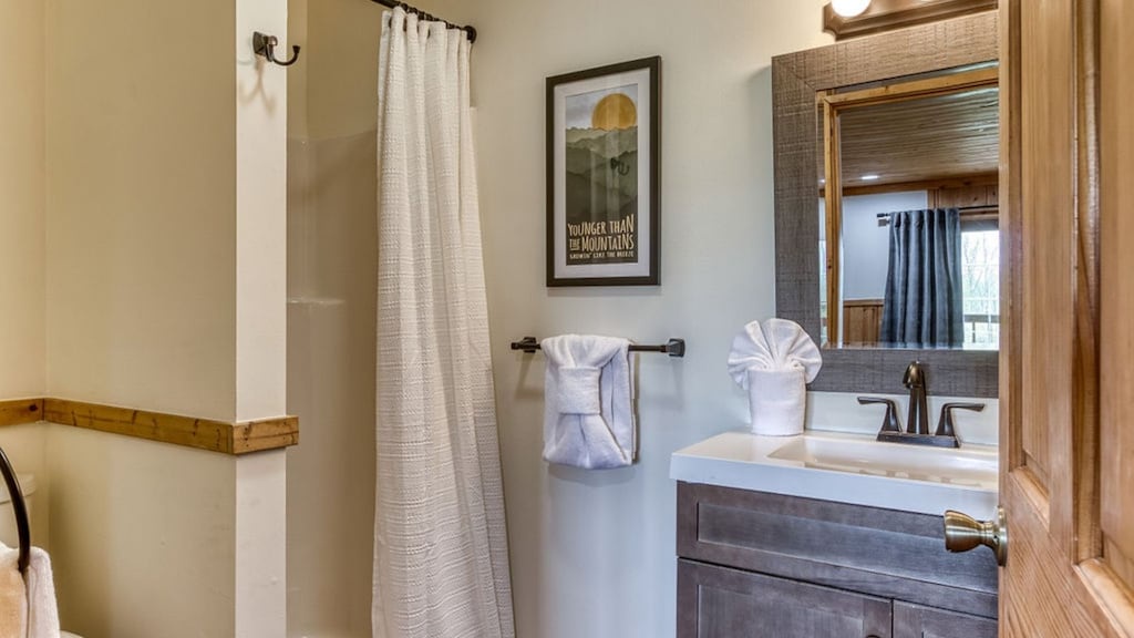 Upon entering the home, you are welcomed to a large and spacious living room with soaring ceilings! Throughout the cabin, you will find a total of four bedrooms and three full bathrooms. Guests will find one bedroom on the main floor, which hosts a king-sized bed and a nicely remodeled en-suite bathroom. Guests will find the top floor with two additional bedrooms, which host 1 king and 1 queen-sized beds. The lower level is where guests will find the kids' bedroom with two bunk beds, one of which is a twin-over-twin bunk bed and the second is a twin-over-queen bunk bed -- plenty of sleeping arrangements for all of your little ones (or big ones!). Each room has cozy bedding and comfortable beds to help ensure a restful night's sleep. You can pack light, because each bathroom contains towels and starter soaps, shampoos, toilet paper, and other bathroom essentials.