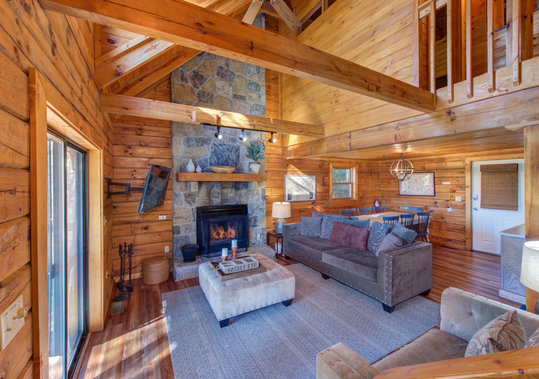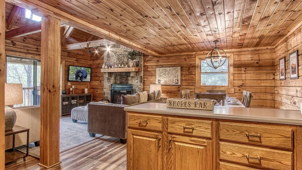 Younger Than the Mountains living room is designed for both entertainment and relaxation, so whether you're a couch potato or you spend just a few hours a day in your living room, you'll get the most out of it thanks to the included amenities. You'll find a large screen TV, a fireplace for cozy nights, and plush couches so you can watch a movie, read a book, or warm up while chatting about your daily adventures in the Smokies!