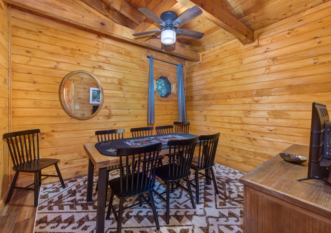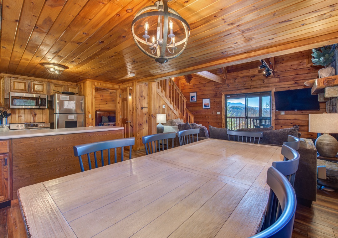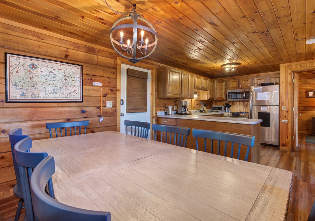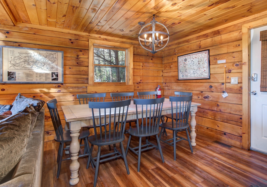 Meals are an important aspect of every vacation, and while the area offers a multitude of restaurants for every culinary craving, if you never want to leave the house to eat, you certainly don't have to! Younger Than The Mountains offers a fully equipped kitchen complete with everything you need to prepare your own farm-to-table meal, including a standard-size refrigerator, oven, stove, toaster, pots, pans, and cutlery. The updated kitchen also has brand-new stainless-steel appliances. With an open design, there's plenty of counter space to cook and enjoy meals! The dining area is situated right off the kitchen area, with seating large enough to gather and enjoy your meals comfortably.